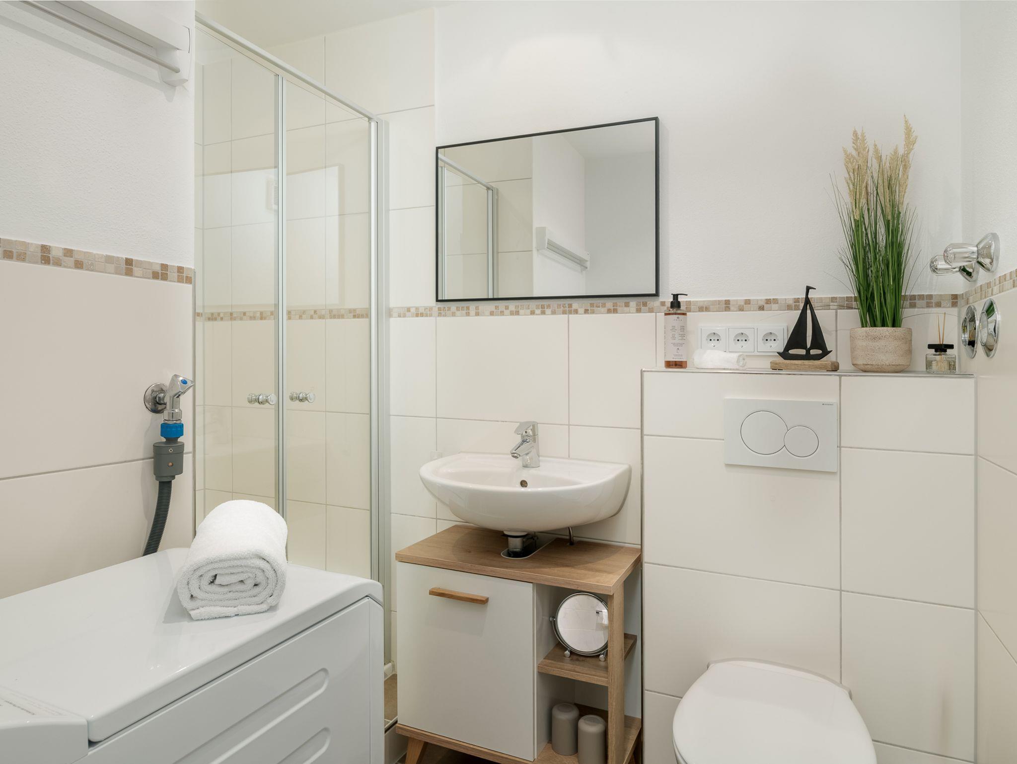Das Badezimmer ist mit einer Dusche ausgestattet und verfügt auch über eine Waschmaschine.