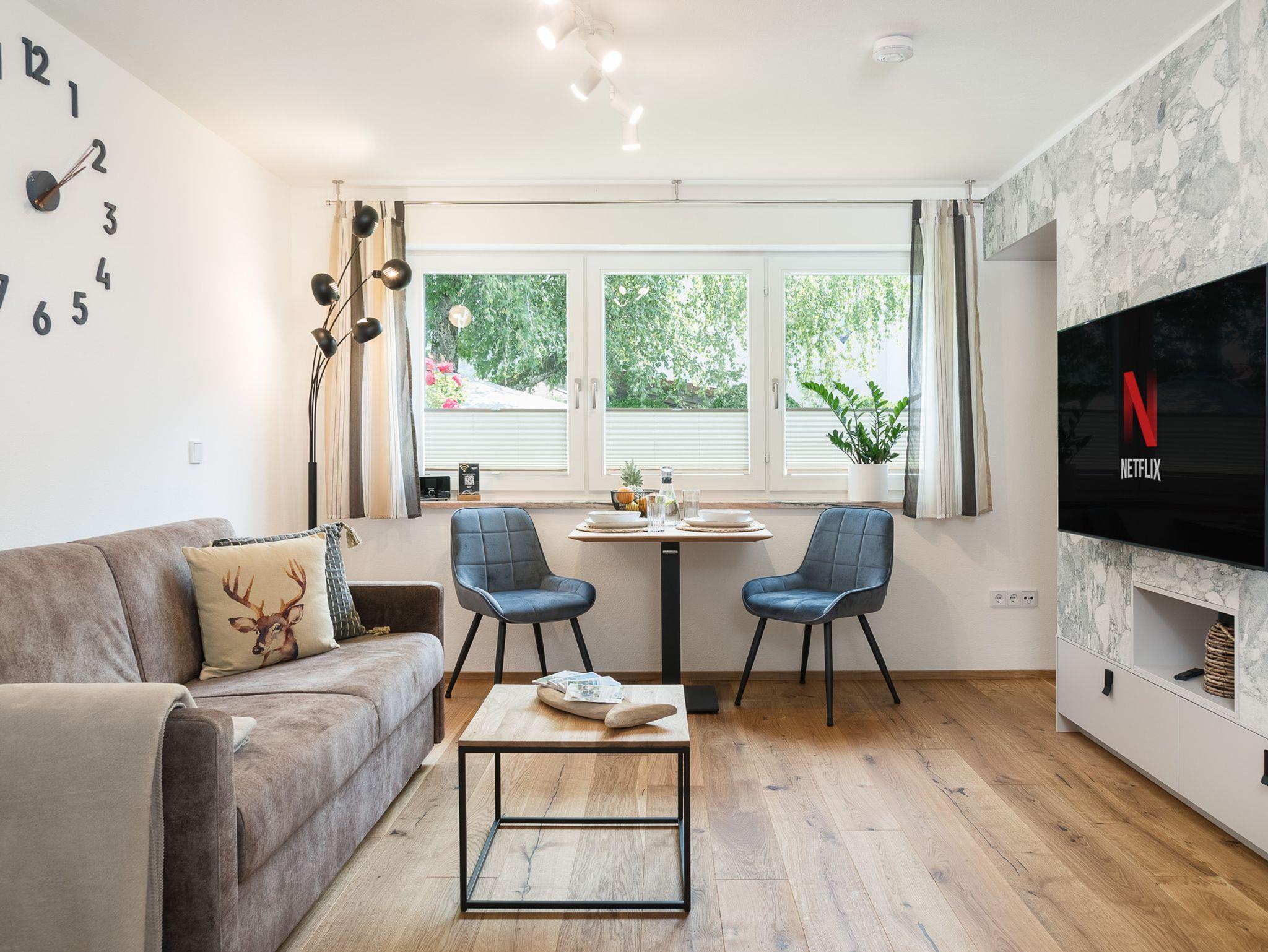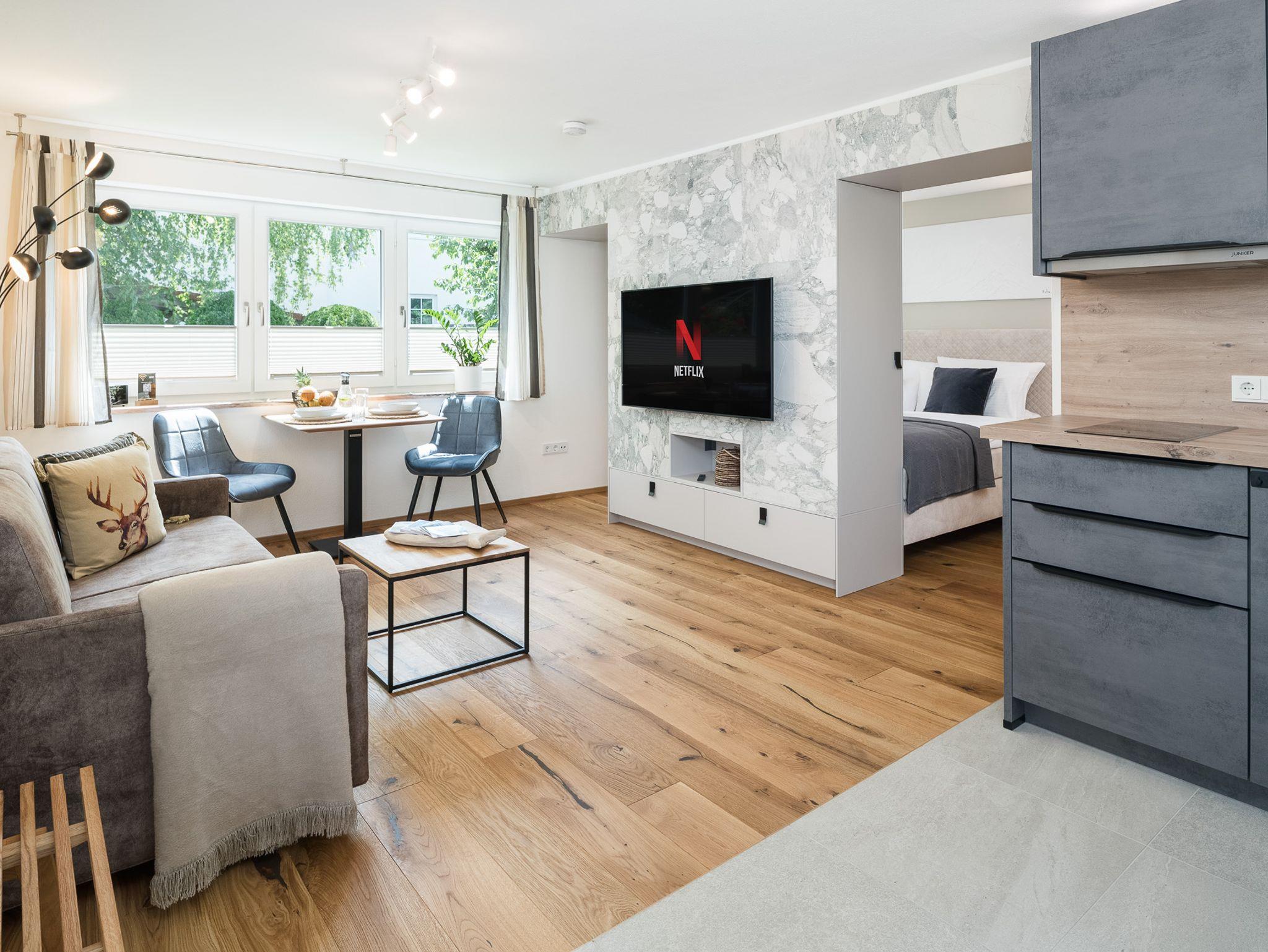 Entspann Dich im Wohnbereich mit gemütlichem Ambiente, das mit einem 55-Zoll-Smart-TV inkl. NETFLIX und Internet-TV in UHD-Qualität ausgestattet ist. Genieße Deine Lieblingssendungen und Filme in bester Bildqualität.