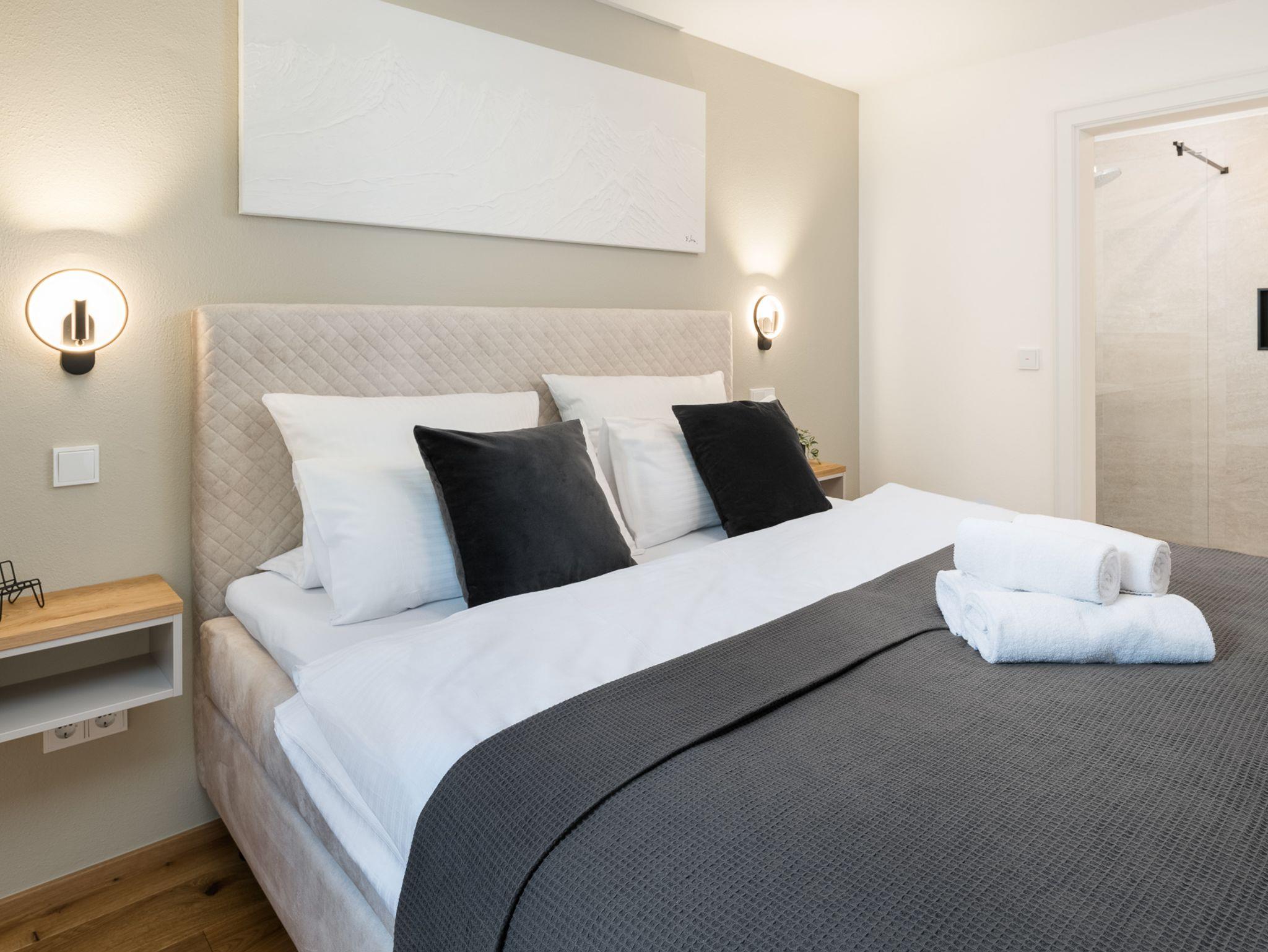 Genieße nach einem erlebnisreichen Tag pure Erfrischung in der hochwertigen, begehbaren Dusche unseres stilvollen Badezimmers.