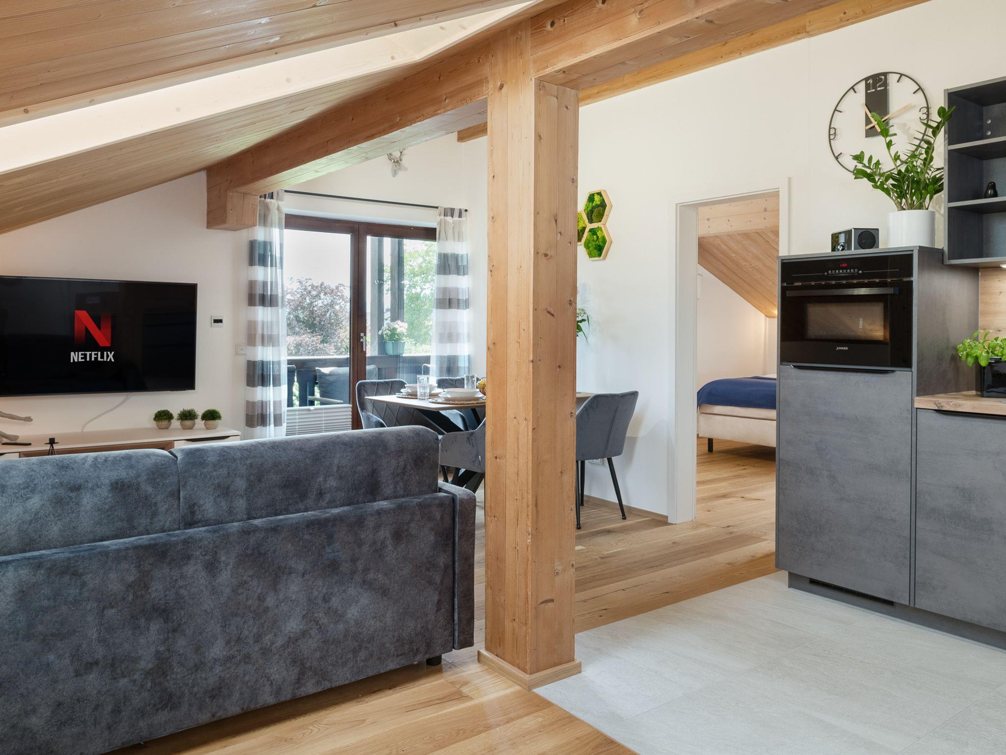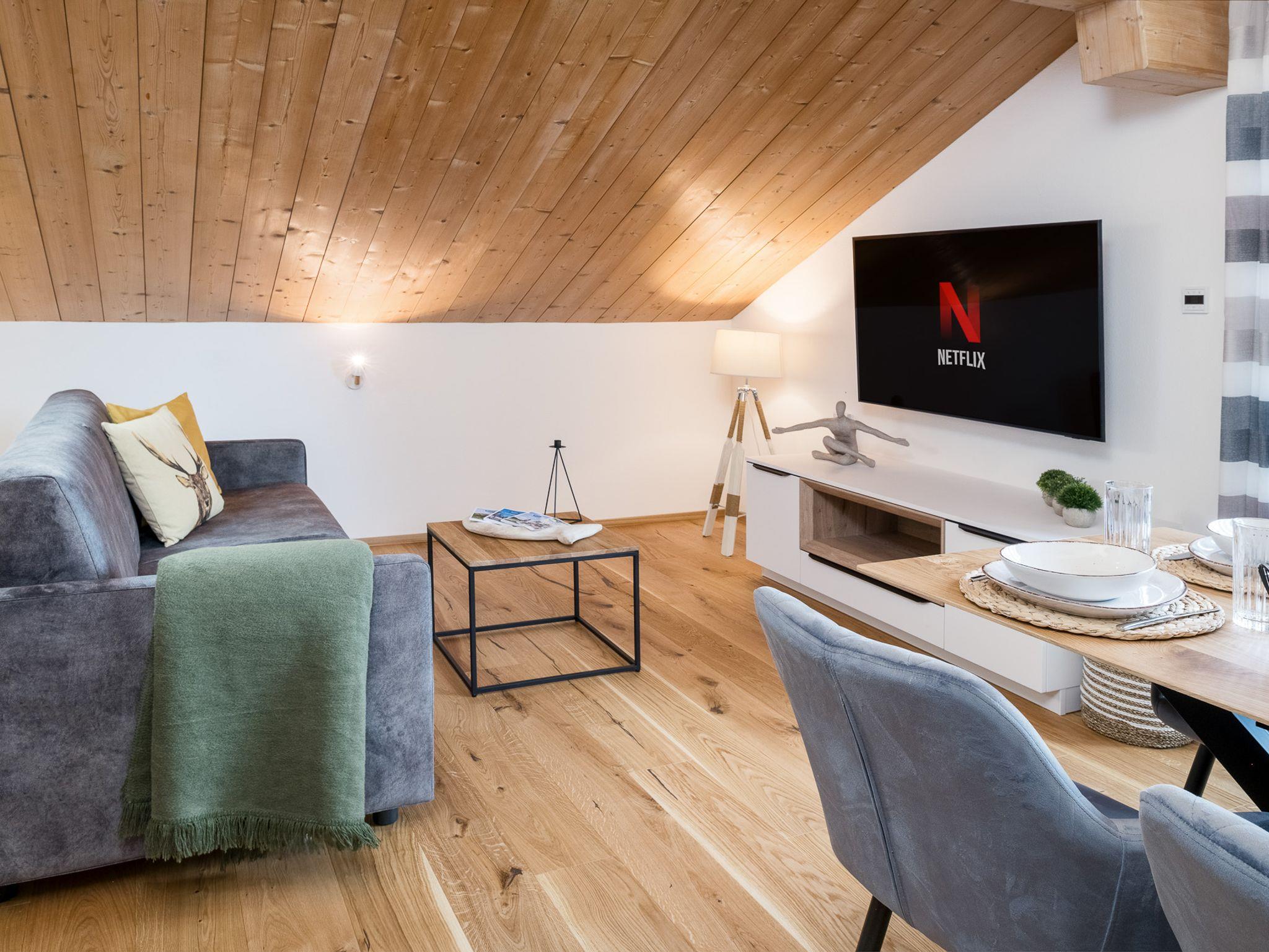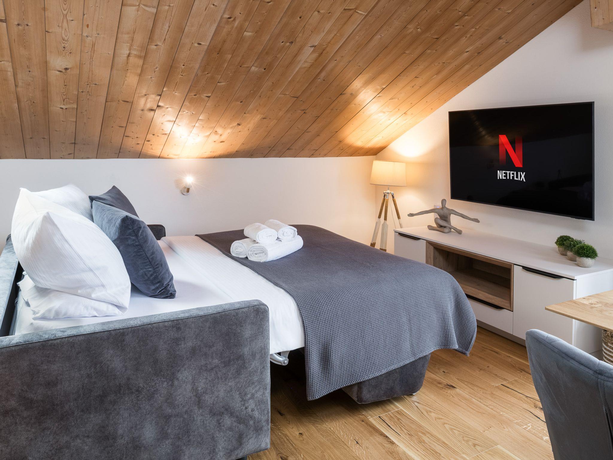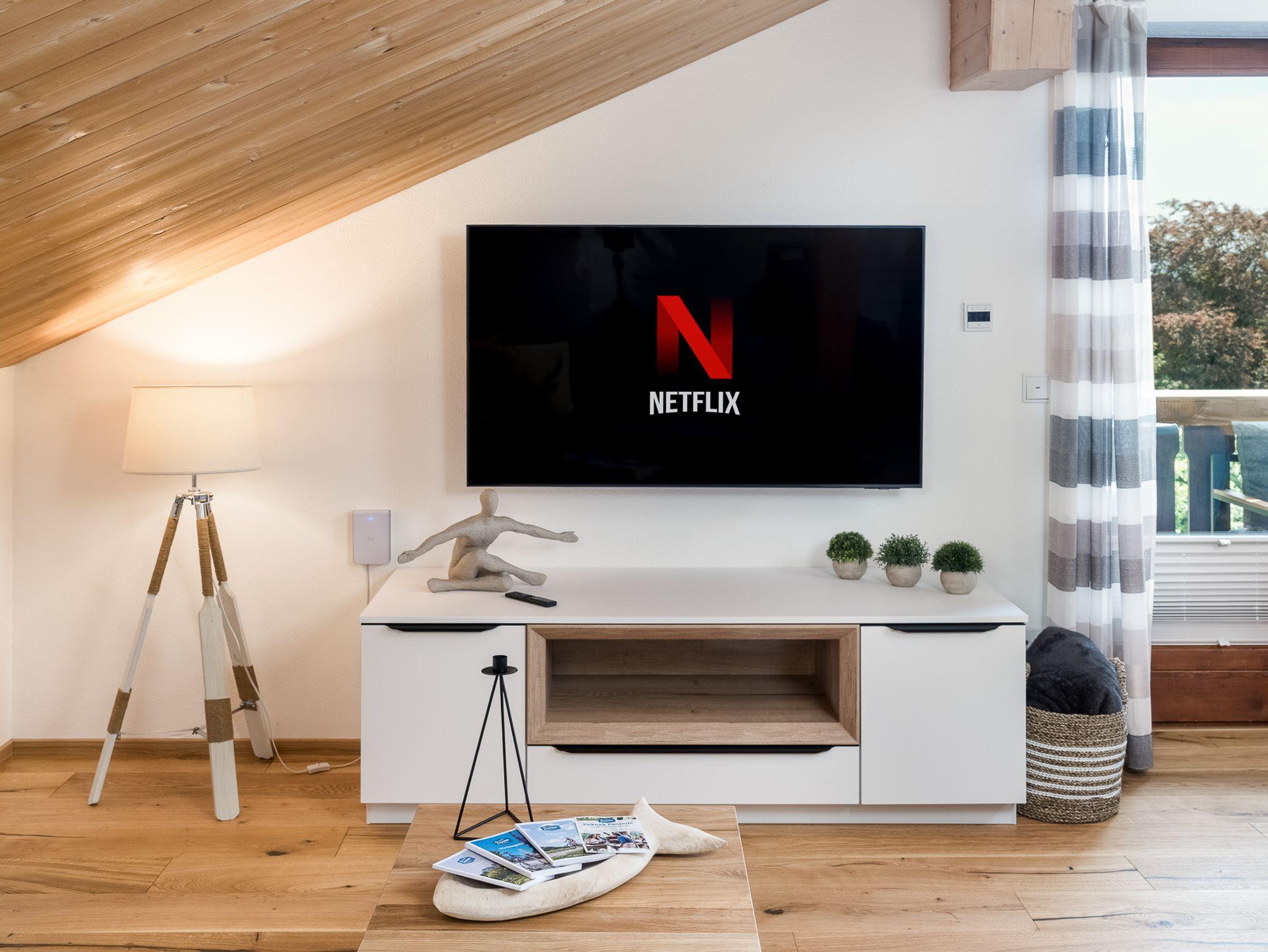 Entspann Dich im Wohnzimmer mit gemütlichem Ambiente, das mit einem 55-Zoll-Smart-TV inkl. NETFLIX und Internet-TV in UHD-Qualität ausgestattet ist. Genieße Deine Lieblingssendungen und Filme in bester Bildqualität.