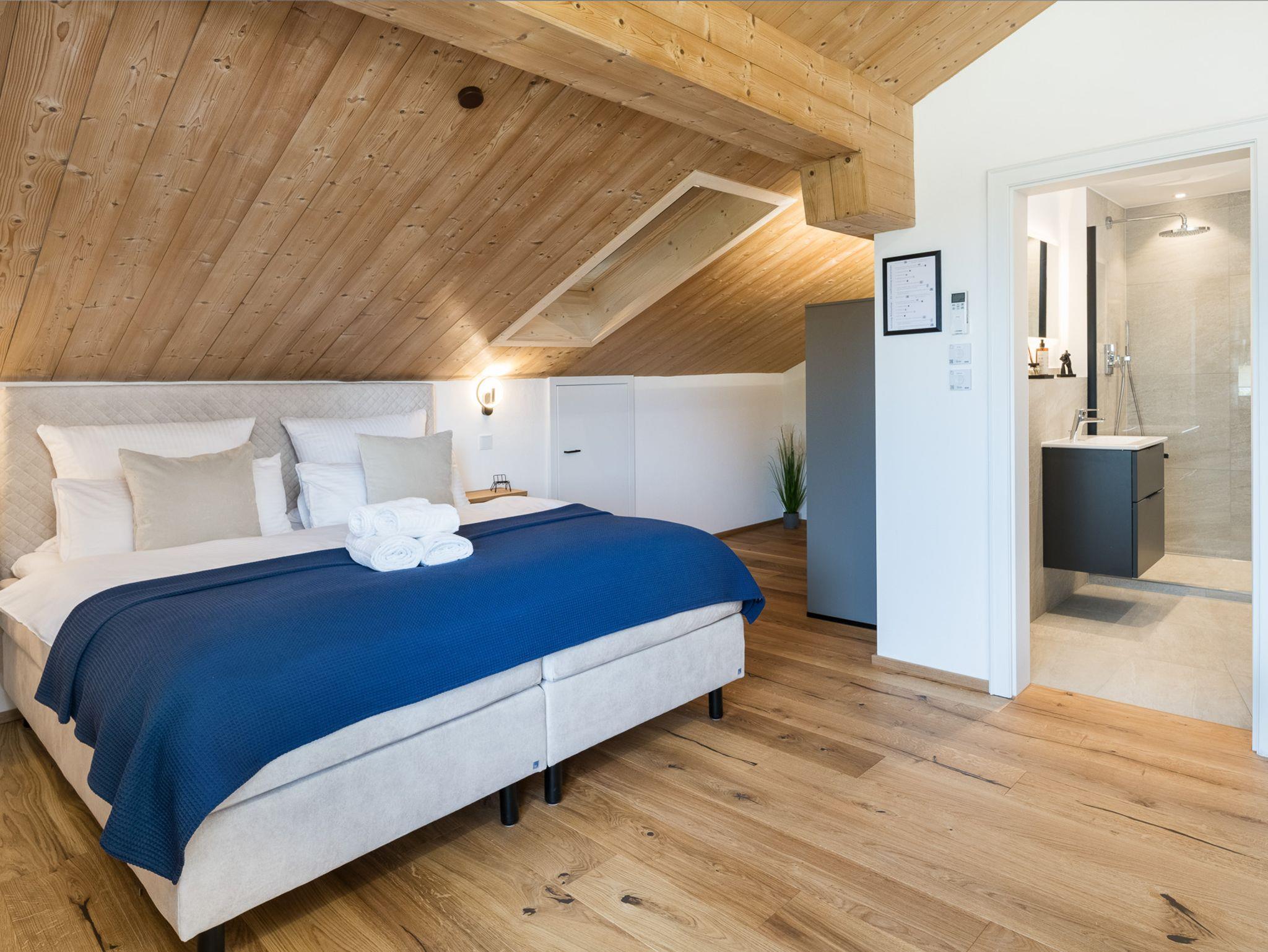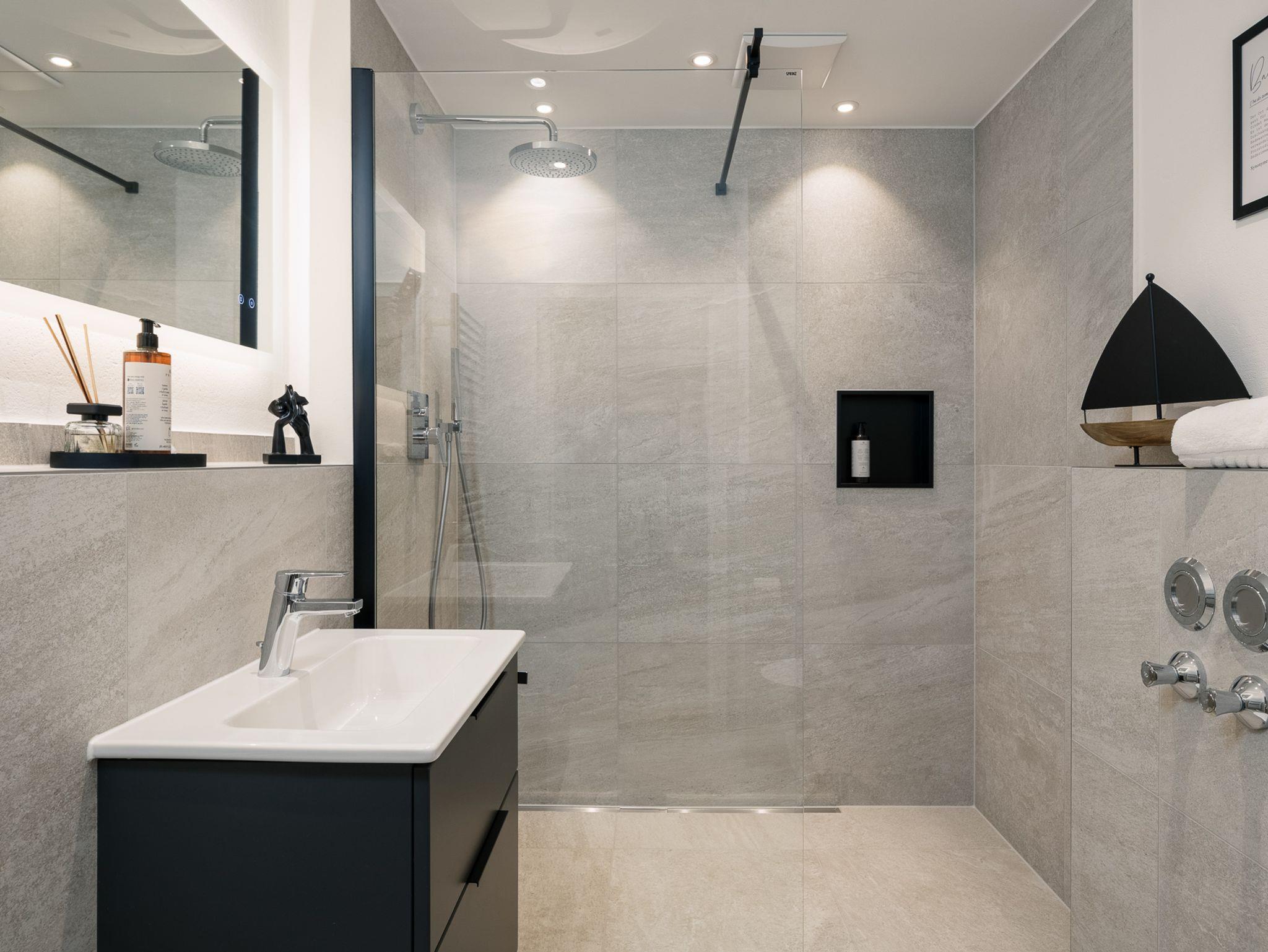 Genieße nach einem erlebnisreichen Tag pure Erfrischung in der hochwertigen, begehbaren Dusche unseres stilvollen Badezimmers.