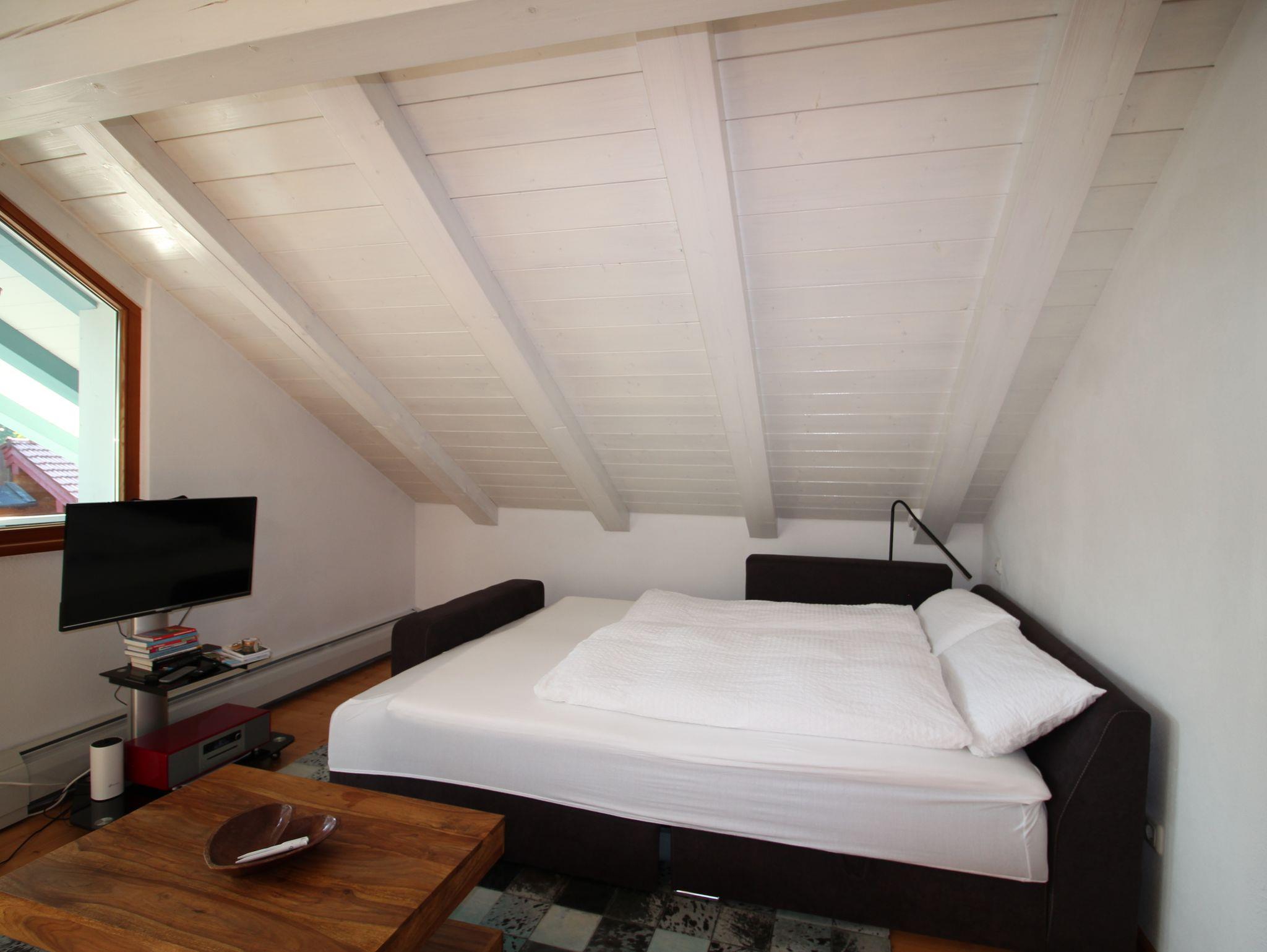 Im Schlafzimmer steht Ihnen ein 1,80 m breites Bett mit gemütlichen Matrazen und Daunenbetten und -kissen zur Verfügung (alternative Kissen liegen bereit), um Ihnen den optimalen Schlaf zu ermöglichen. Schrank, Schreibtisch und Kofferablage vervollständigen das Angebot.