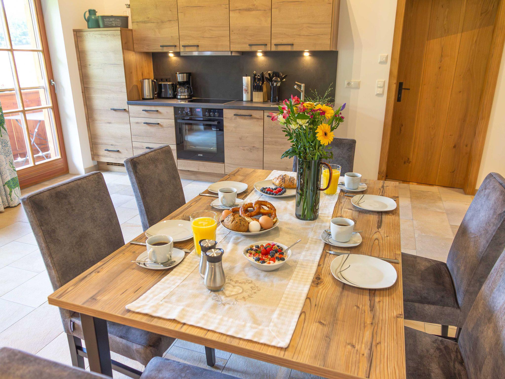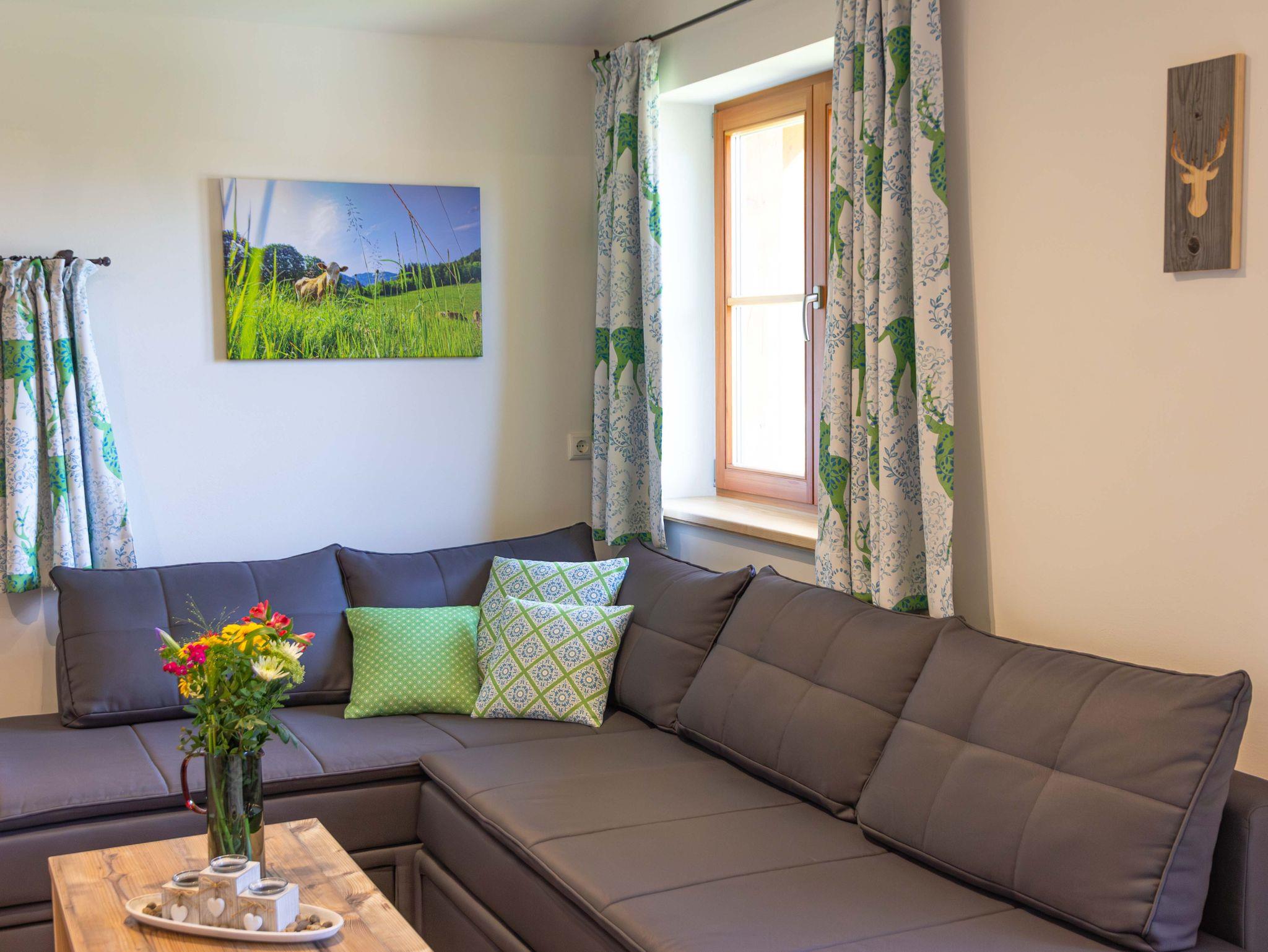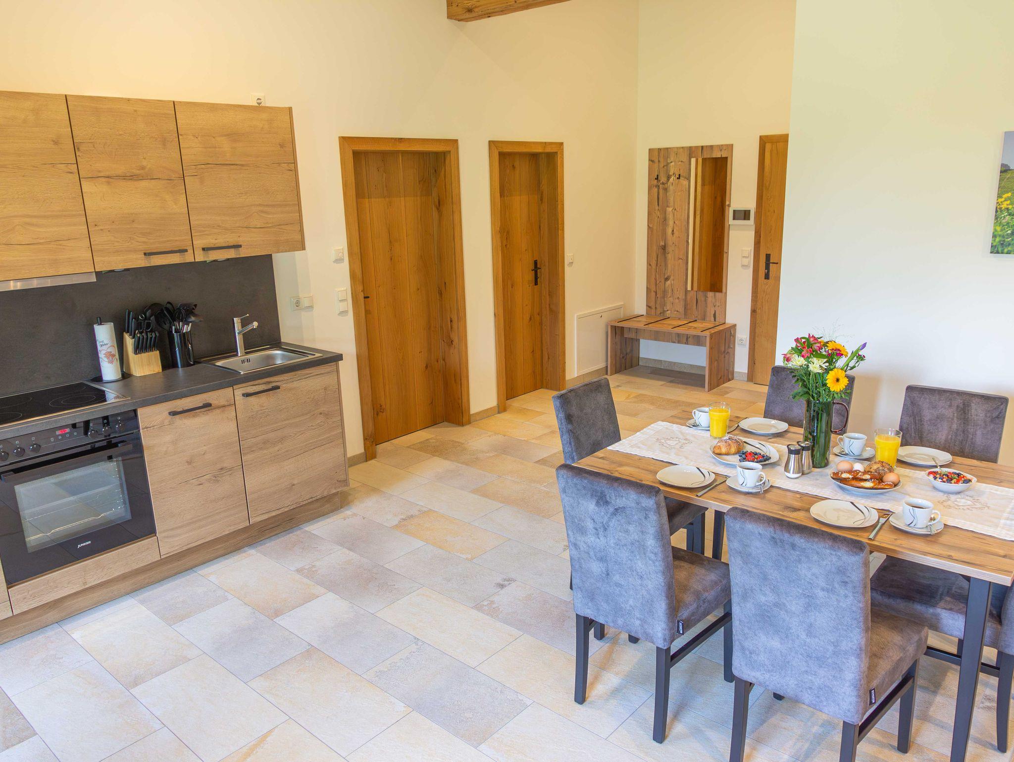 Mit der „Kampenwand“-Wohnung bieten wir Ihnen eine exklusive Unterkunft, die sich ideal für Familien eignet und eine gemütliche Atmosphäre bietet. Sie zeichnet sich durch ihren großen Wohnbereich mit einer modernen Küche aus. Vom Balkon aus können Sie den direkten Blick auf die umliegenden Wälder und Wiesen genießen. Wir laden Sie herzlich dazu ein, Ihren Urlaub auf dem Wieserhof zu verbringen und freuen uns auf Ihren Besuch.