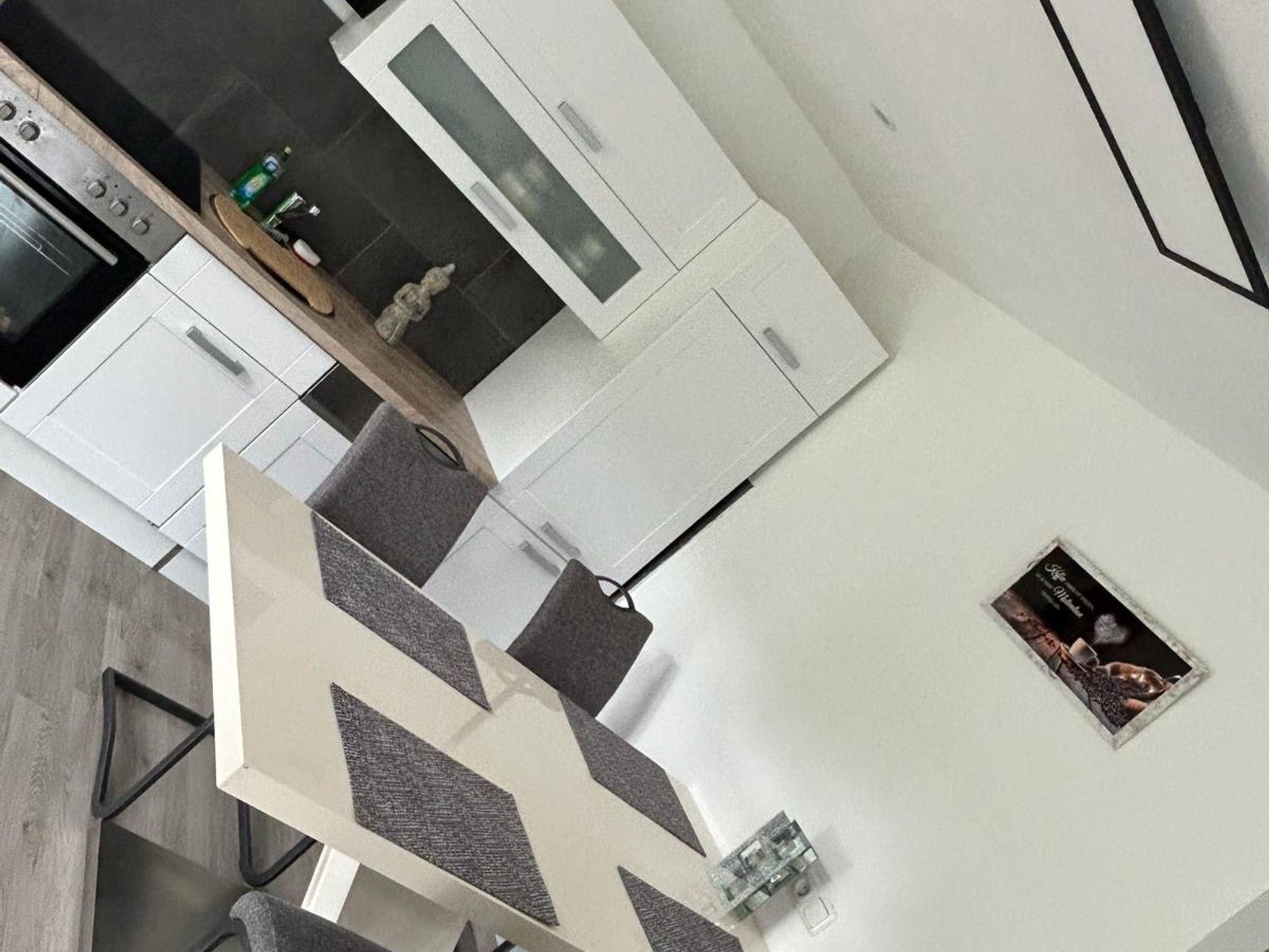 Essecke, Wohnzimmer mit großem Flat-TV und Sofa und einer Küche mit Spülmaschine, Kaffeevollautomat, Backofen, Kühlschrank mit kleinem Gefrierfach und weiteren Elektrogeräten wie Toaster, Wasserkocher, Kaffeemaschine; ein kleineres Zimmer mit einem Doppelbett; ein großes Schlafzimmer mit einem Doppelbett in L-Ausführung; ein Badezimmer mit