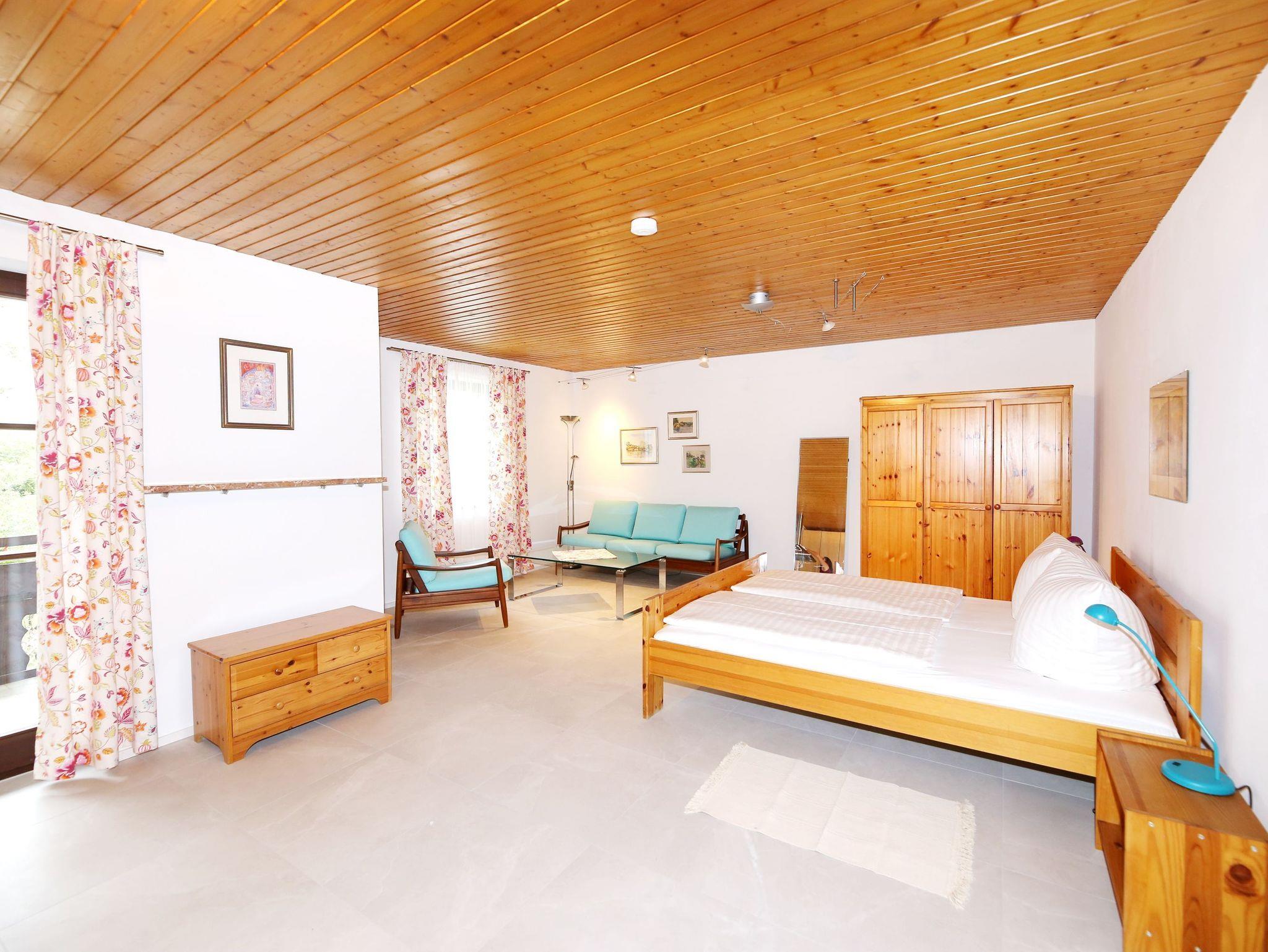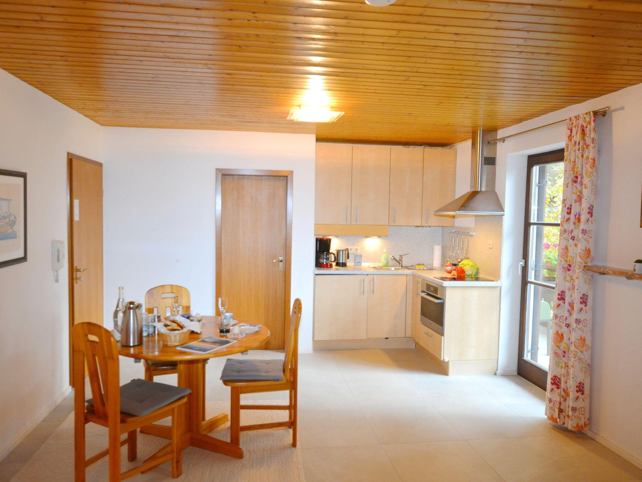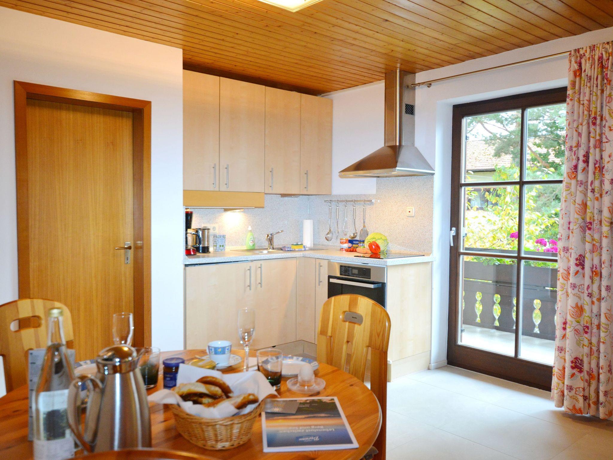 Der offene, sehr geräumige Wohn-, Ess- und Schlafbereich überzeugt mit einer Wohnecke, Flatscreen-TV, Essbereich und offener Küche. Eine Sitzecke mit Tisch und Stühlen bietet genug Platz zum Speisen, Verweilen oder auch mal zum Arbeiten. Die Küche mit einem Zwei-Platten-Herd und Backofen ist mit allen wichtigen Utensilien, die zum Kochen benötigt werden, ausgestattet. Vom Küchenbereich aus betreten Sie den Ost-Balkon - hier können Sie die Sonnenaufgänge bei einer Tasse Kaffee genießen. Ideal zum Frühstücken in der aufgehenden Chiemgauer Morgensonne.