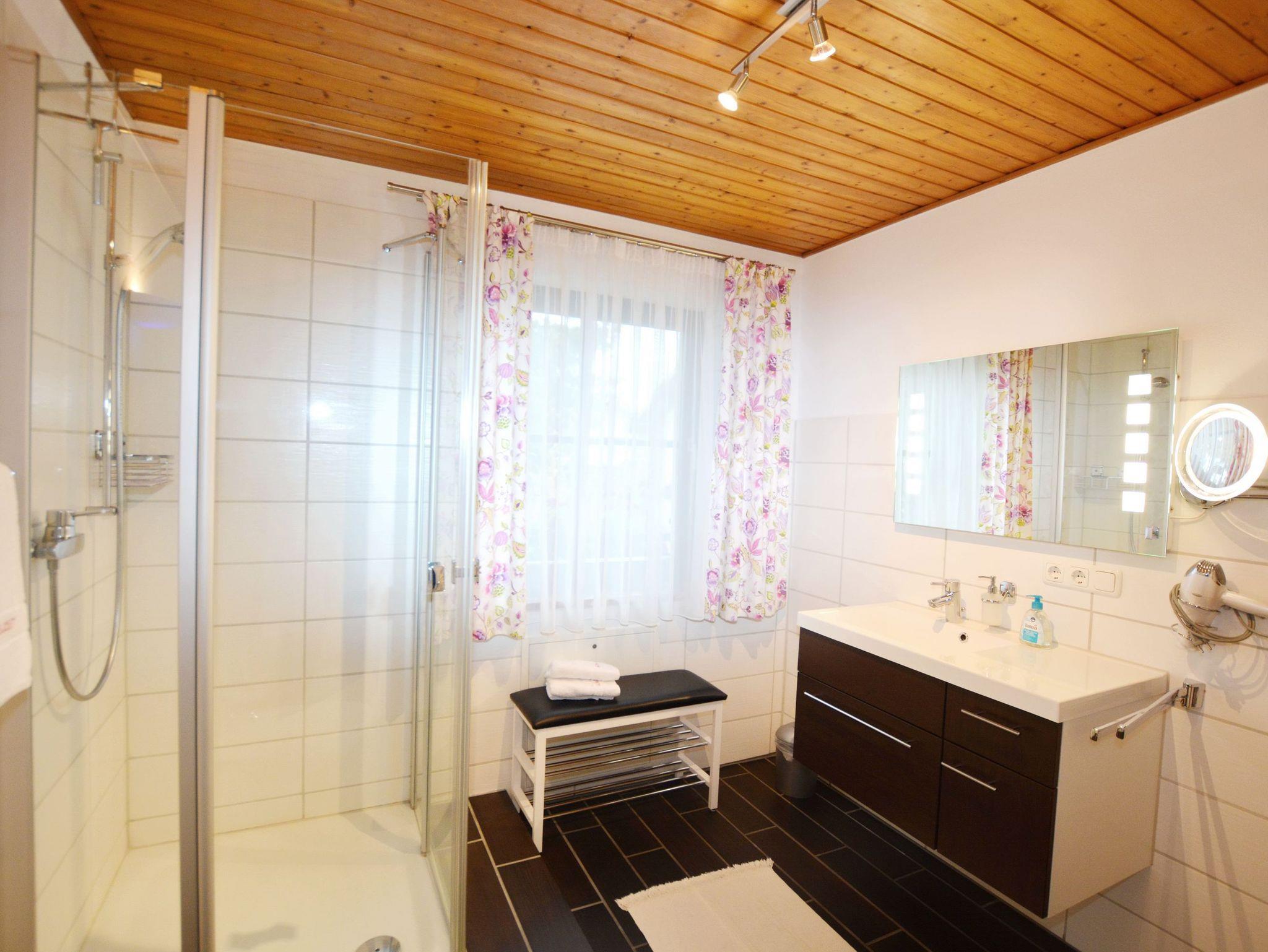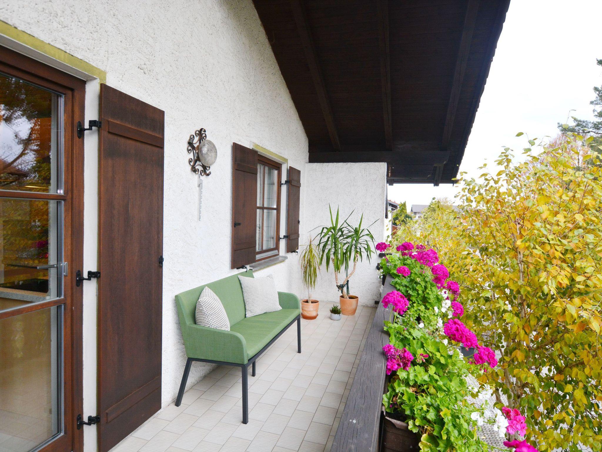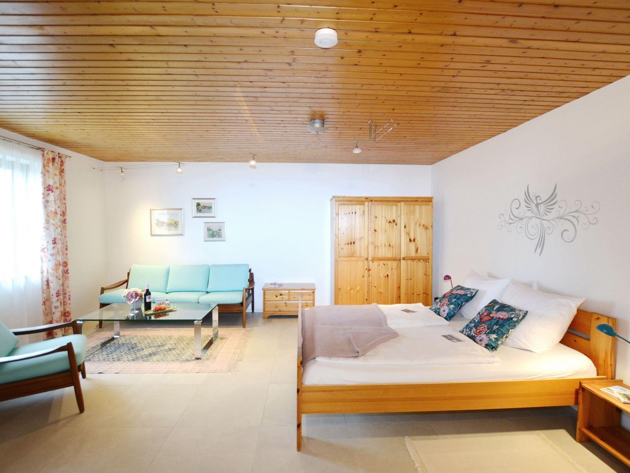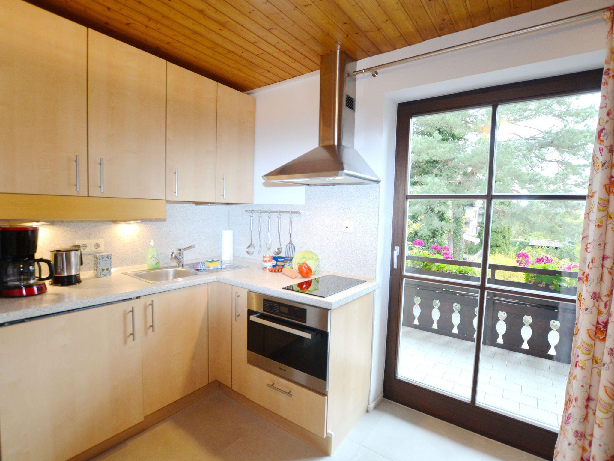 Der offene, sehr geräumige Wohn-, Ess- und Schlafbereich überzeugt mit einer Wohnecke, Flatscreen-TV, Essbereich und offener Küche. Eine Sitzecke mit Tisch und Stühlen bietet genug Platz zum Speisen, Verweilen oder auch mal zum Arbeiten. Die Küche mit einem Zwei-Platten-Herd und Backofen ist mit allen wichtigen Utensilien, die zum Kochen benötigt werden, ausgestattet. Vom Küchenbereich aus betreten Sie den Ost-Balkon - hier können Sie die Sonnenaufgänge bei einer Tasse Kaffee genießen. Ideal zum Frühstücken in der aufgehenden Chiemgauer Morgensonne.