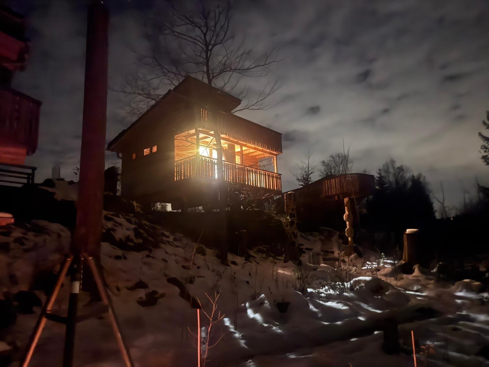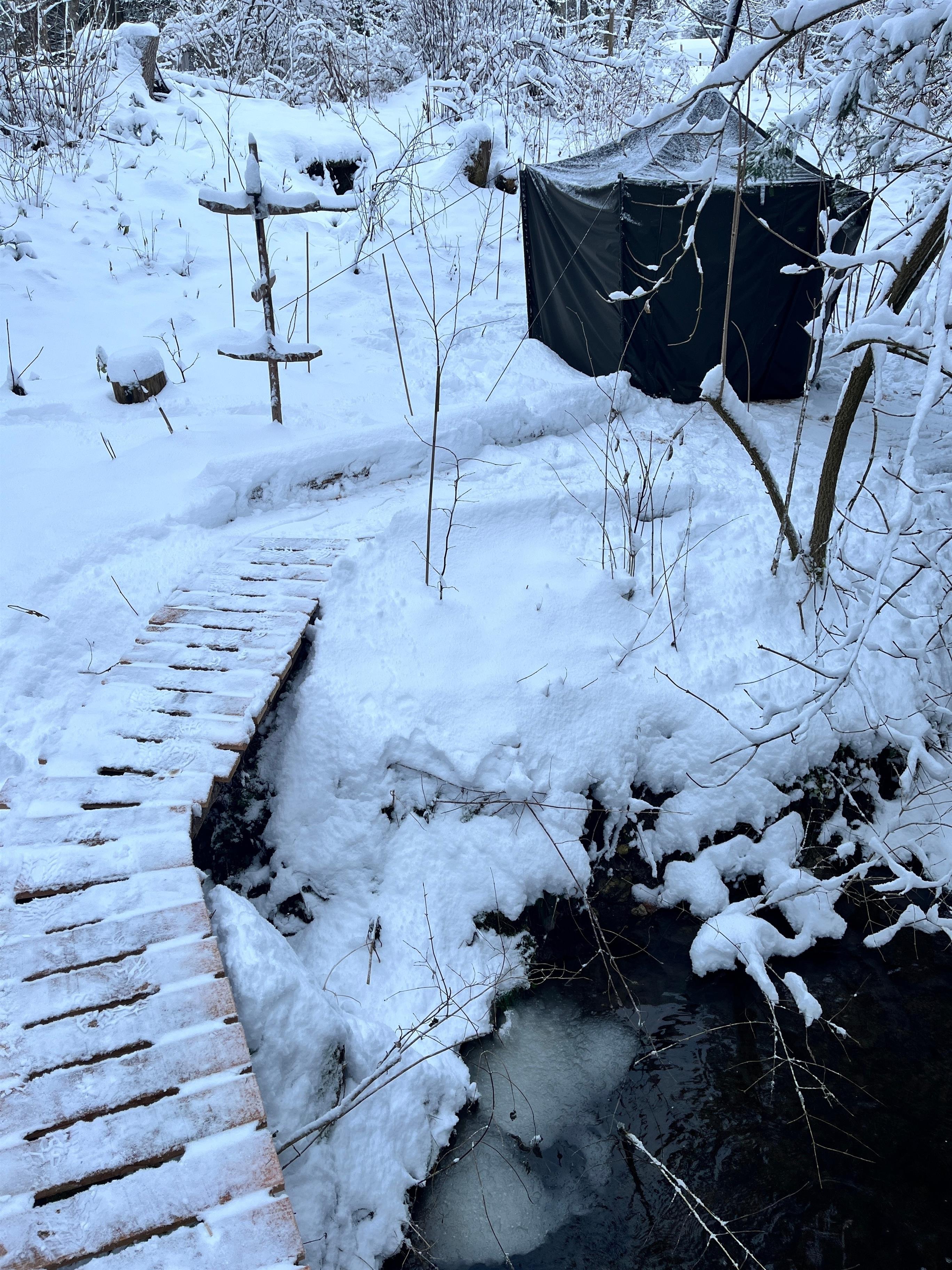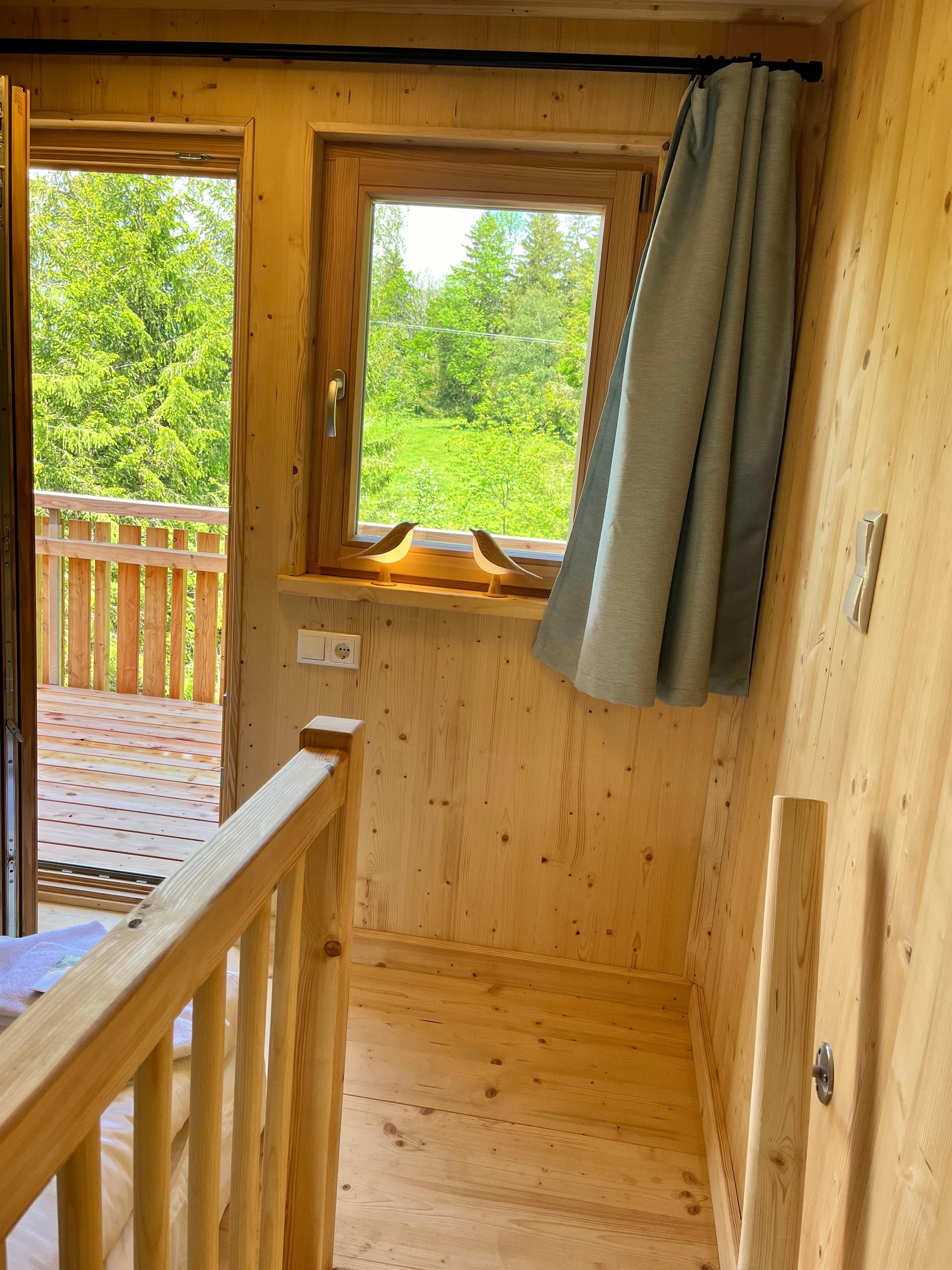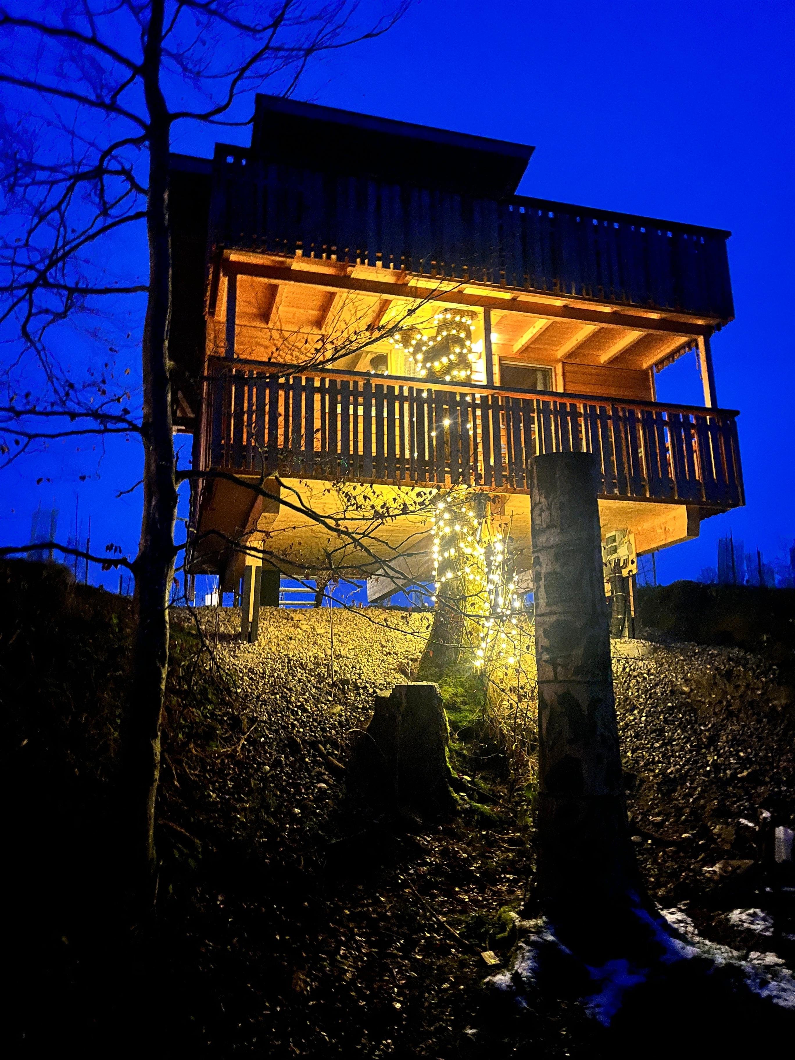 Das Baumstelzenhaus ist 2024 in nachhaltiger Holzständerbauweise gebaut, energetisch gedämmt, mit Fußbodenheizung und Solarstrom ganzjährig bewohnbar. Auf 30 qm fehlt es an nichts und beantwortet die Frage: Wieviel Platz braucht man eigentlich zum Leben. Voll ausgestattete Tinyküche, 2 Schlafzimmer auf 2 Etagen, verbunden über eine Trittleiter, Bad mit Dusche und WC, ein abenteuerliches Galeriebett unter dem Dach, 2 Balkone mit integriertem Baumstamm. Kleine Besonderheit: Eine estländische Zeltsauna versteckt sich im Wald direkt am Bach. Mit Holzofen. Rustikal.