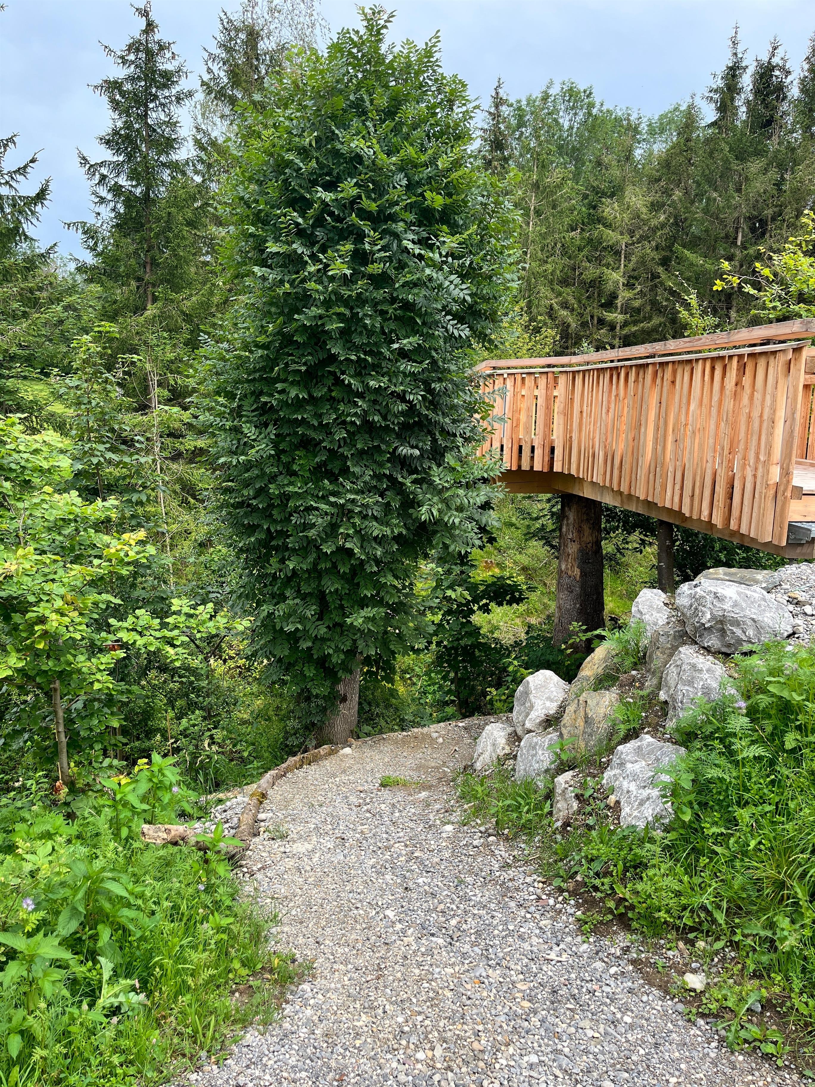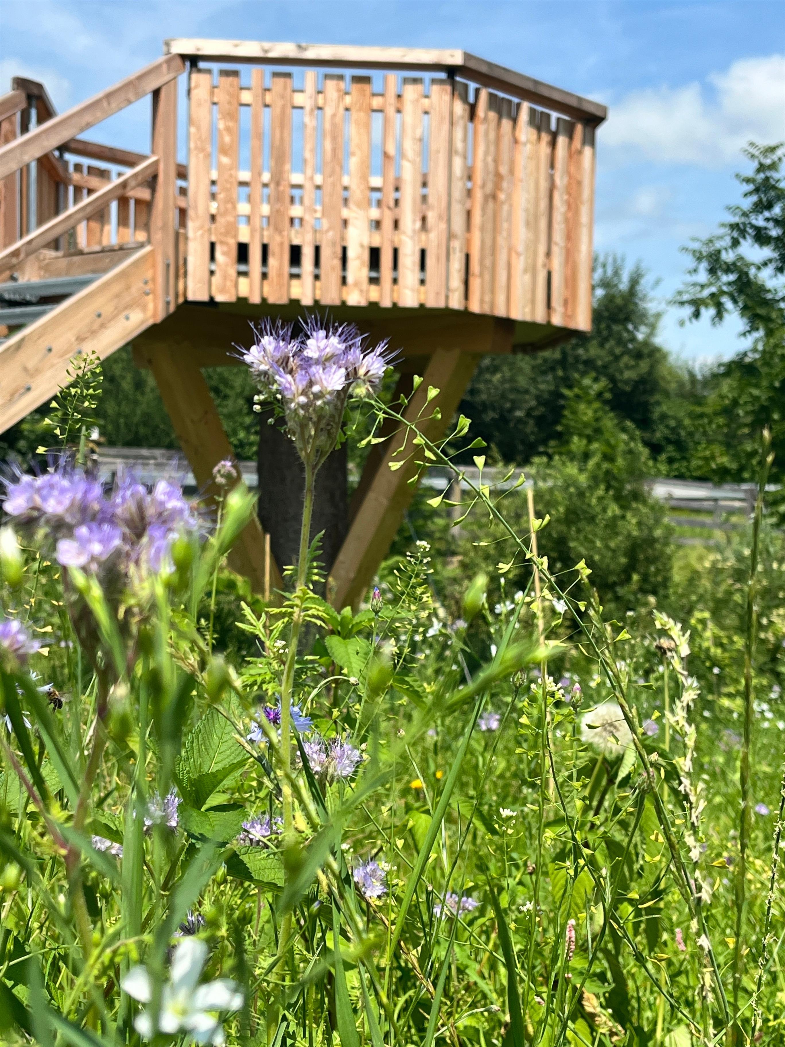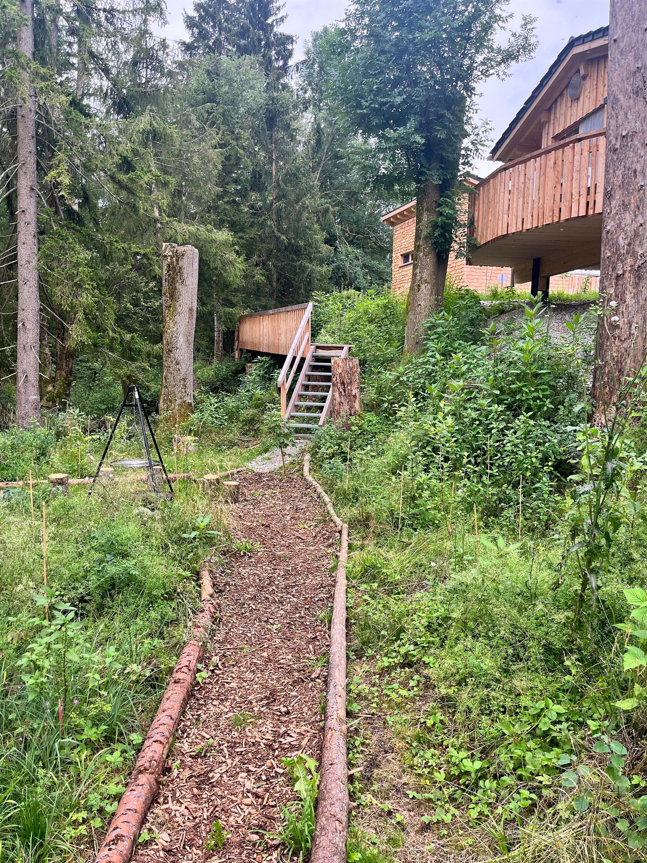 Mensch und Natur begegnen sich auf Augenhöhe. Die Entschleunigung beginnt bei der Anreise. Die letzten ca. 150m geht es vom Parkplatz zu Fuß und mit Leiterwagen zum Baumstelzenhaus. Dort erwarten Dich eine Blüh- und Streuobstwiese, ein neu gepflanzter Wald aus teilweise noch sehr kleinen, heimischen und fremdländischen Gehölzen, ein Bach mit Steg, zwei Baumkanzeln und mittendrin drei Baumstelzenhäuser. Über die Straße befindet sich der Haslacher (Bade)See am Auerberg (1055m).