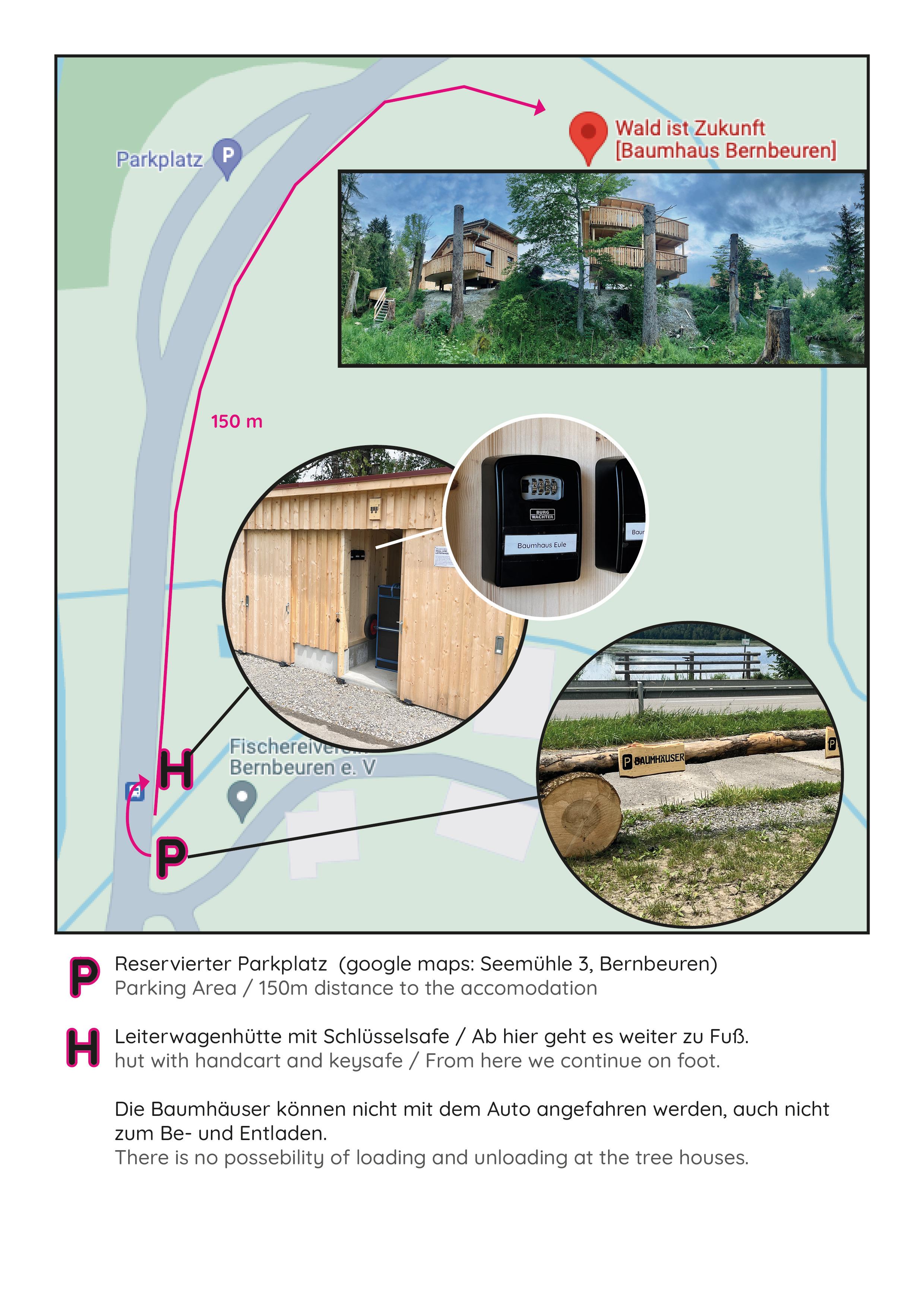Das Gelände und die drei Baumstelzenhäuser sind nicht direkt mit dem Auto zu erreichen, was dem Projektziel entspricht, keine Flächen zu versiegeln. Ein Parkplatz steht in ca. 200m Entfernung an der Seemühle zur Verfügung.