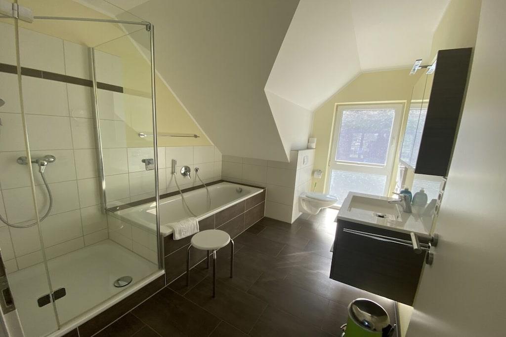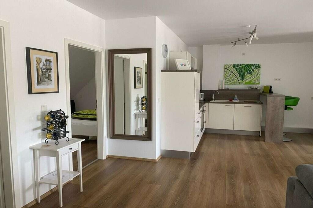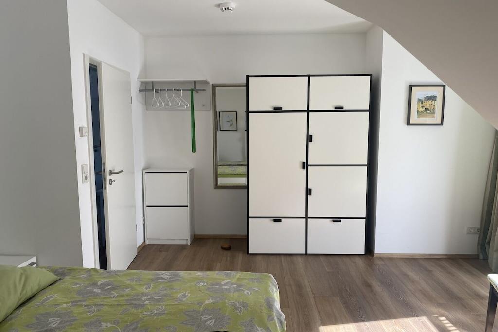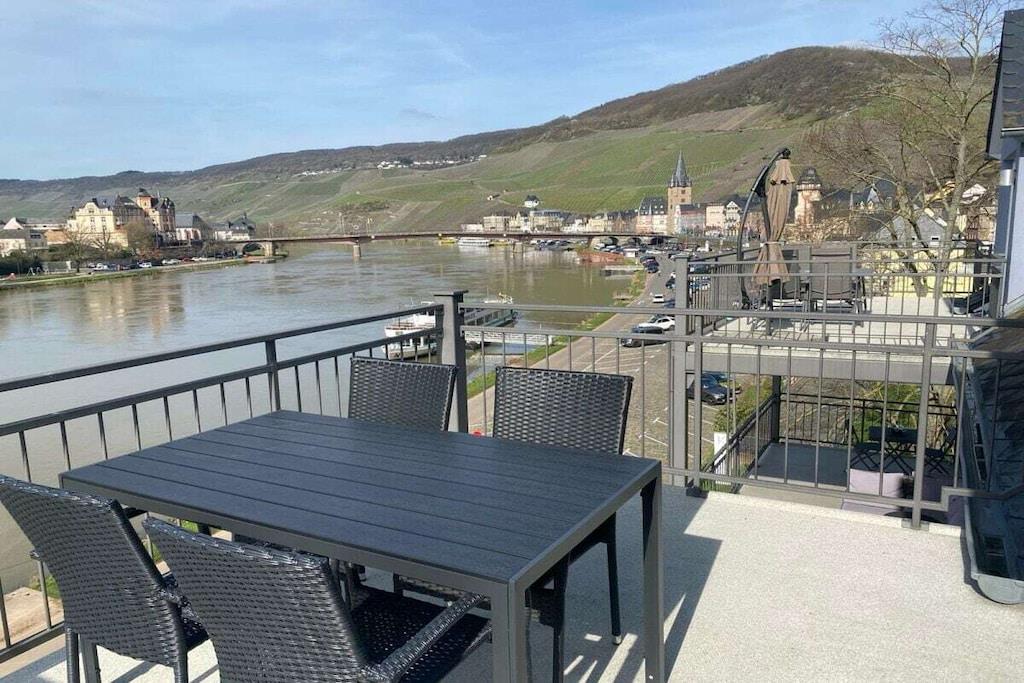 Direkte ved bredden af Mosel-floden, nedenfor det berømte Landshut Slot, med fantastisk udsigt over Mosel og vinmarkerne. Ny, komfortabel og moderne møbleret ferielejlighed (65 m²) med gulvvarme, centralt beliggende på 3. sal i loftet med elevator. Aflåseligt cykelskur, gratis parkering og Wi-Fi. Moderne, fuldt udstyret køkken med opvaskemaskine, keramisk kogeplade og mikrobølgeovn. Åben stue/spisestue og rummeligt soveværelse. Balkon med spisesæt, parasol og justerbar liggestol. En ekstra seng til et barn eller en baby er tilgængelig efter anmodning. En rejseseng og en komfortabel gæsteseng er tilgængelige.