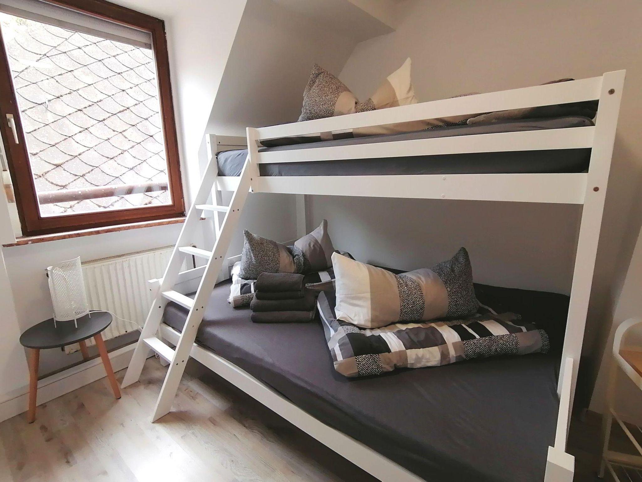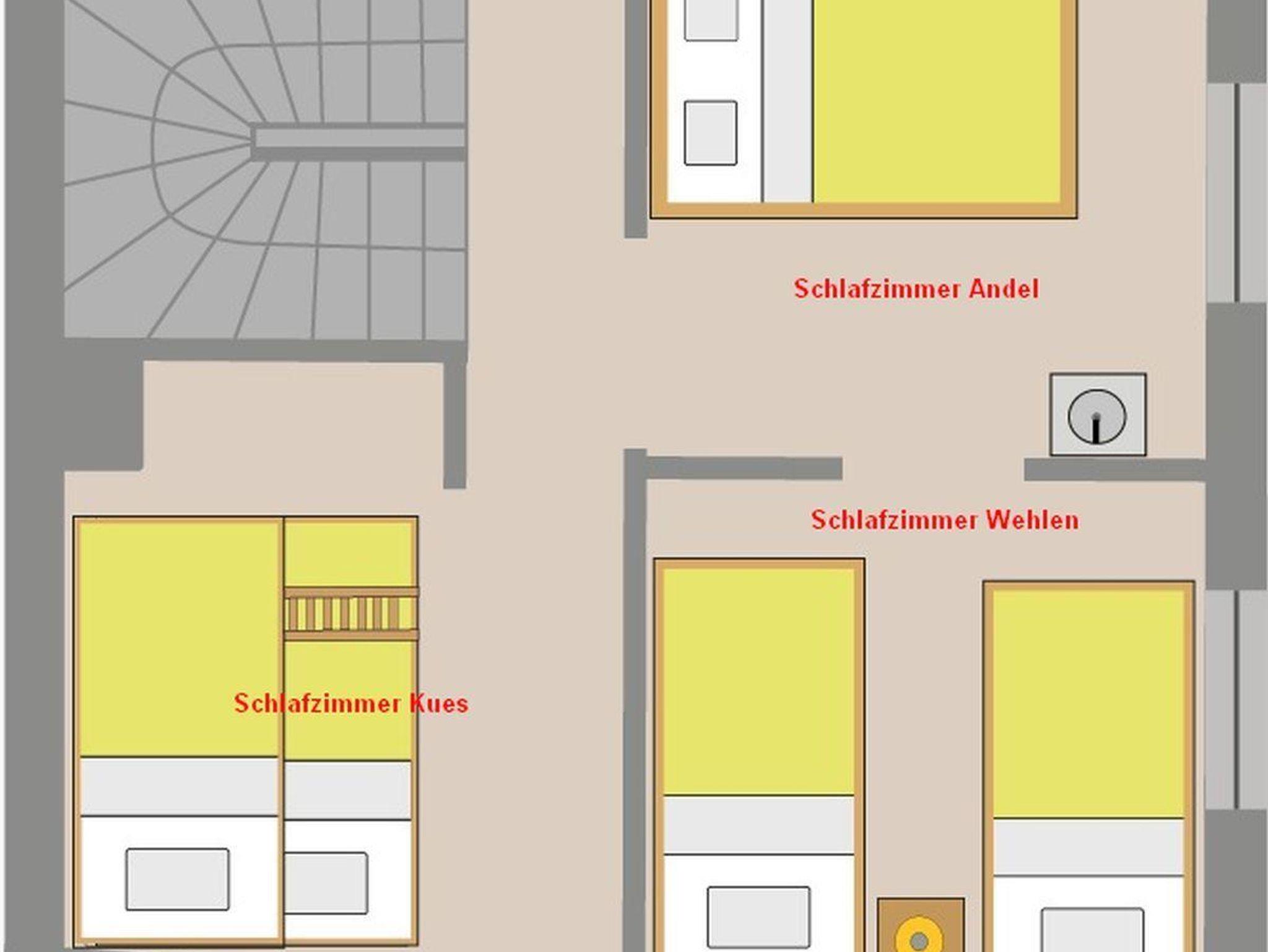 Im 1 Obergeschoss ist das Bad mit Dusche, sowie das große Schlafzimmer Bernkastel. Im Dachgeschoss befinden sich drei kleine Schlafzimmer