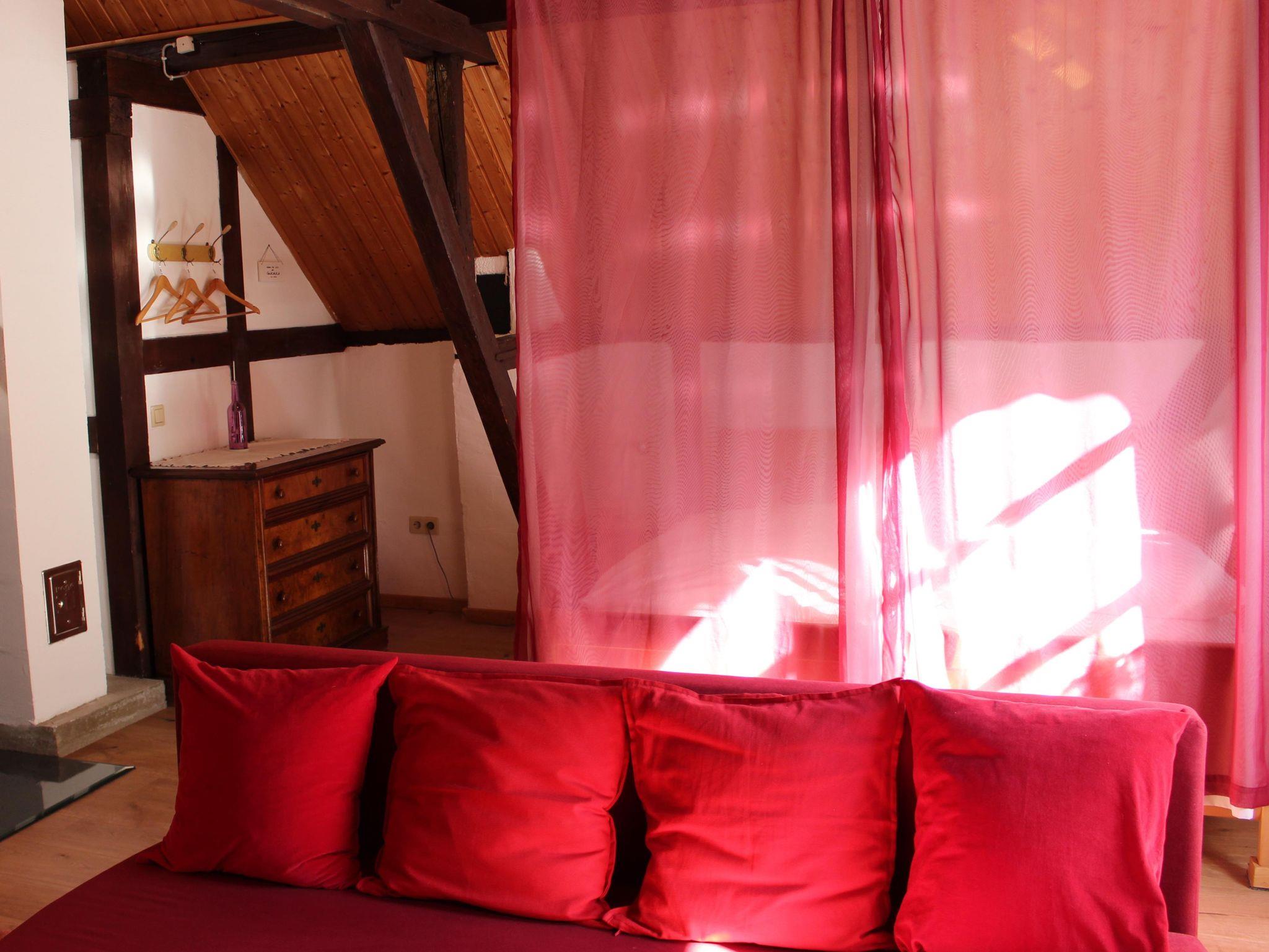 Entspannen Sie in unserem gemütlichen Loft Adlerhorst. Die sonnendurchfluteten 55 qm verfügen über einen großen Raum mit Wohn- und Schlafbereich (Doppelbett 180 cm x 200 cm) und eine volleingerichtete Küche. Sie liegt im dritten Stock des Hauses.