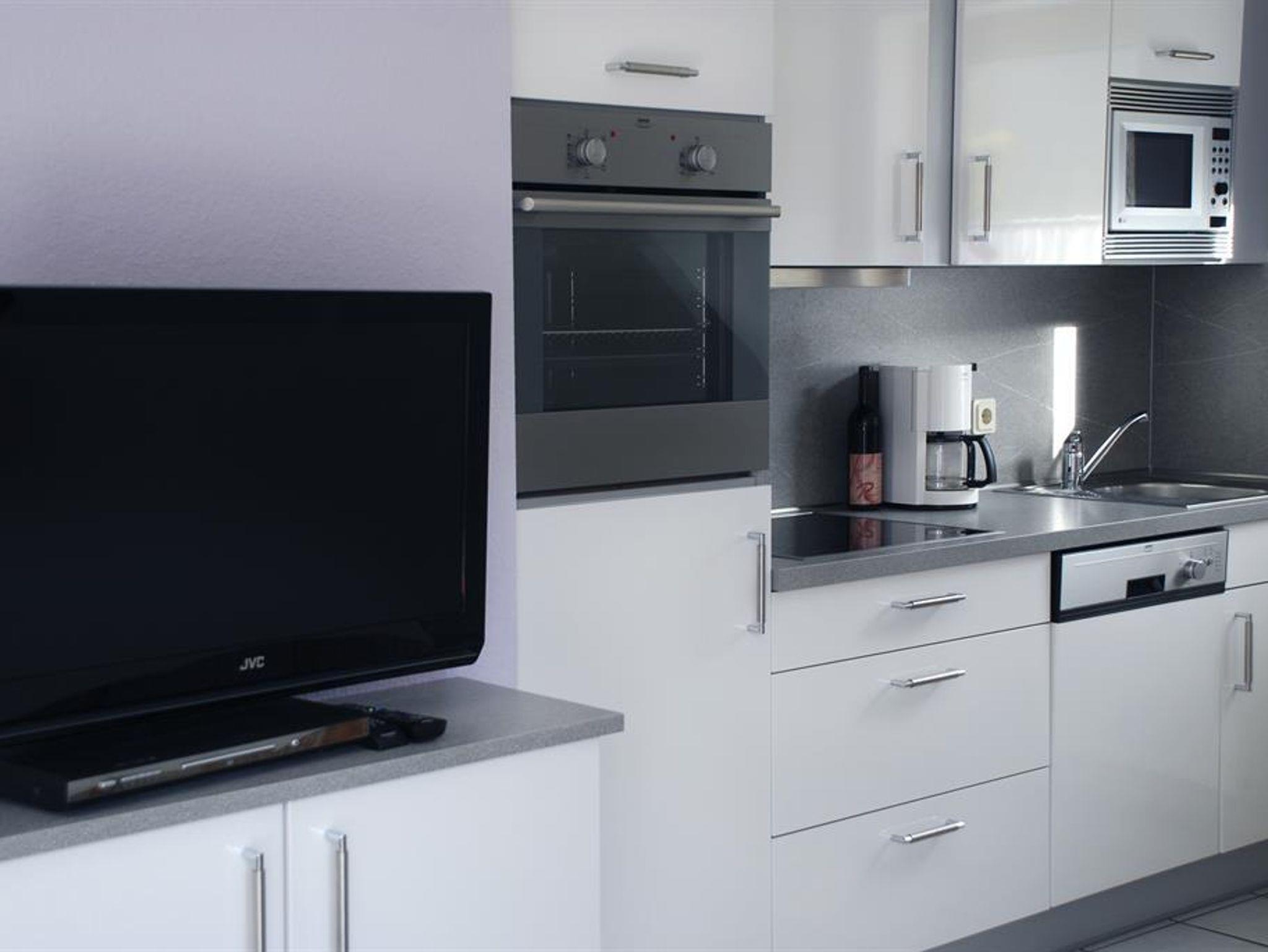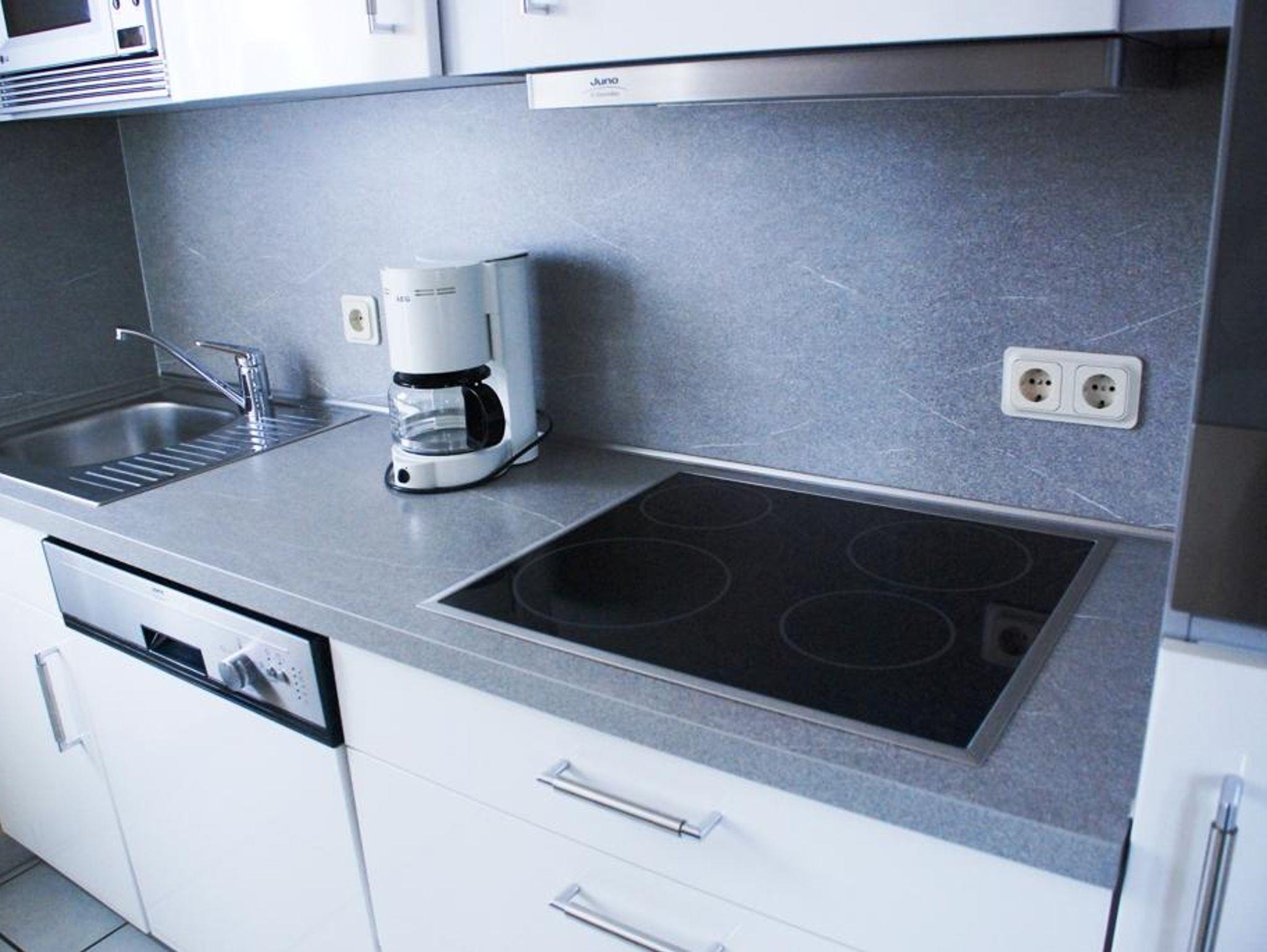 Küche mit Geschirrspüler, 4-Platten-Herd, Mikrowelle, Kühlschrank mit Gefrierfach