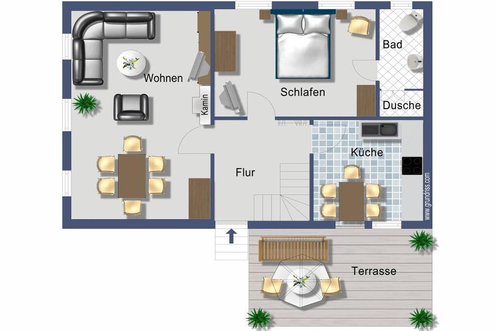 Feriehuset er blevet tildelt 5 stjerner af den tyske turistforening (DTV). I stueetagen (65 m²) er der et soveværelse med dobbeltseng, et tilstødende badeværelse med bruser/toilet og et fuldt udstyret ALNO-køkken af høj kvalitet i landlig stil. I kan selv lave mad eller nyde udsøgt Rhön-mad på landhotellet "Zur Grünen Kutte". I underetagen er der også en stor stue og spisestue med en hyggelig pejs. Hele huset er udstyret med moderne gulvvarme. På øverste etage (45 m²) er der to ekstra soveværelser og et badeværelse med bruser/toilet. Foran huset kan I slappe af på terrassen. Børnene kan boltre sig på den tilstødende legeplads med rutsjebane, hængebro, gynger og meget mere.