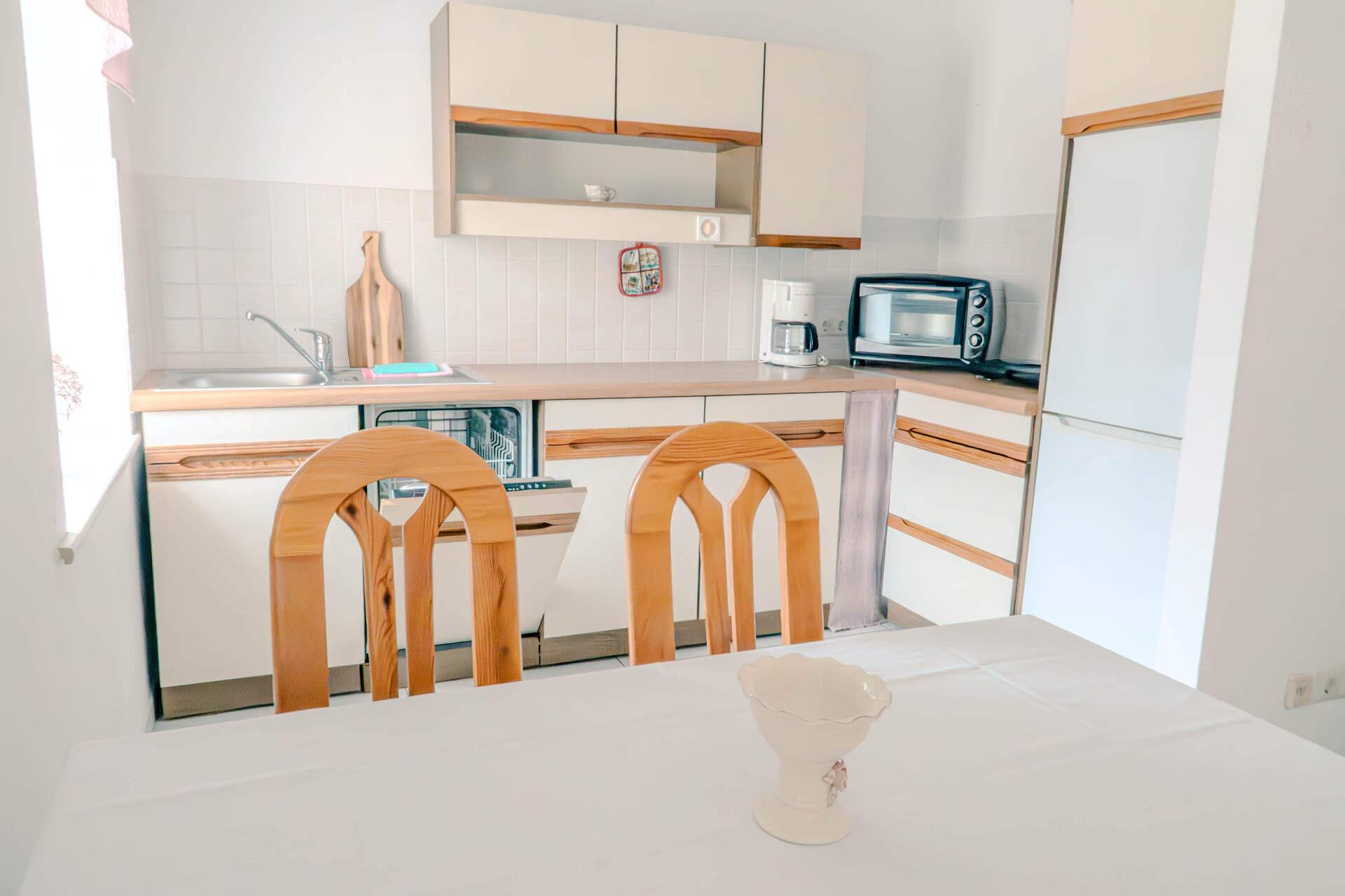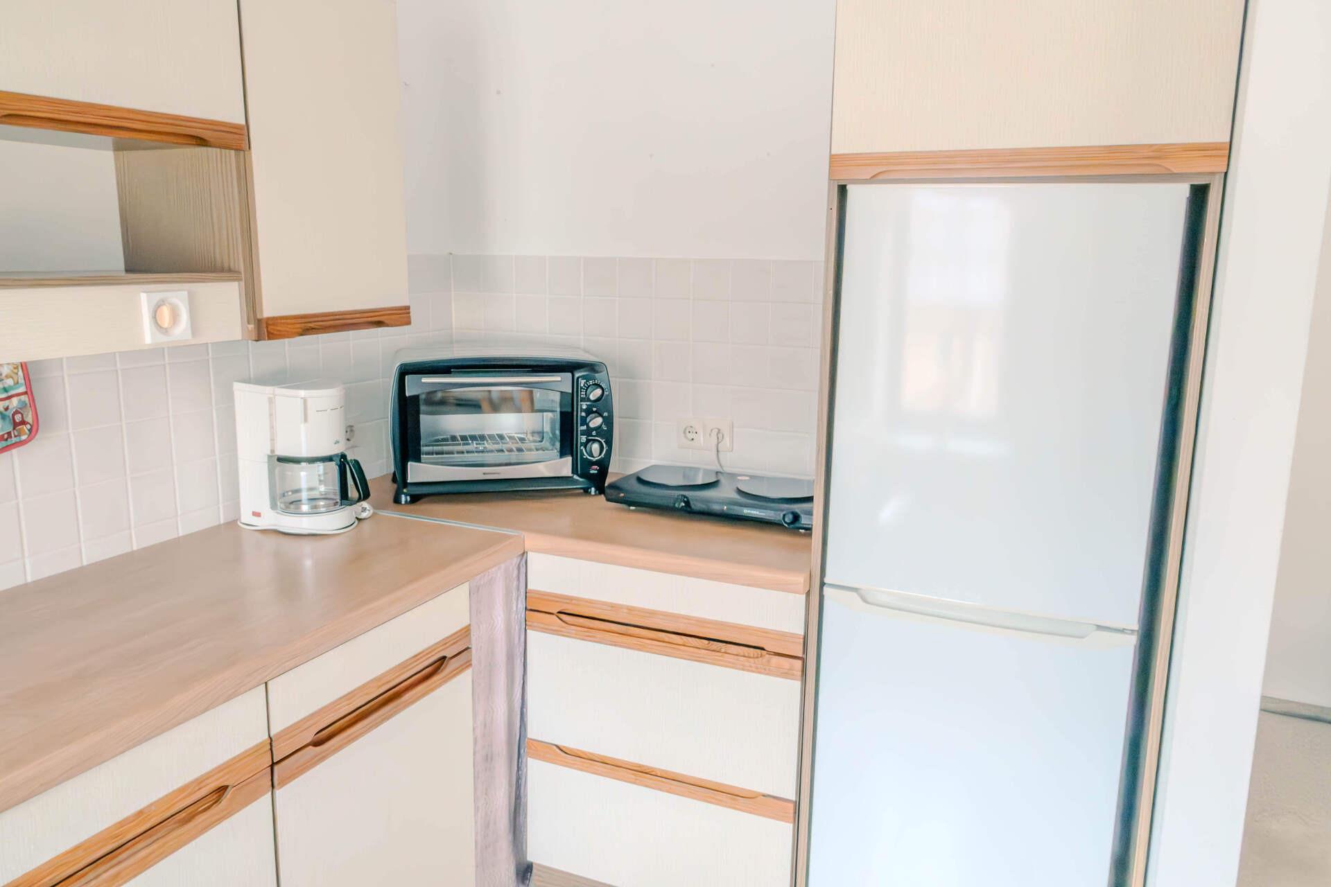 Die Unterkunft verfügt über zwei Zimmer: ein separates Schlafzimmer mit Doppelbett sowie ein Wohn-/Esszimmer mit offener Küche. Ein Zustellbett für eine dritte Person ist bei Bedarf möglich. Die Räume sind funktional und zugleich gemütlich gestaltet, sodass sich Gäste schnell zuhause fühlen können.