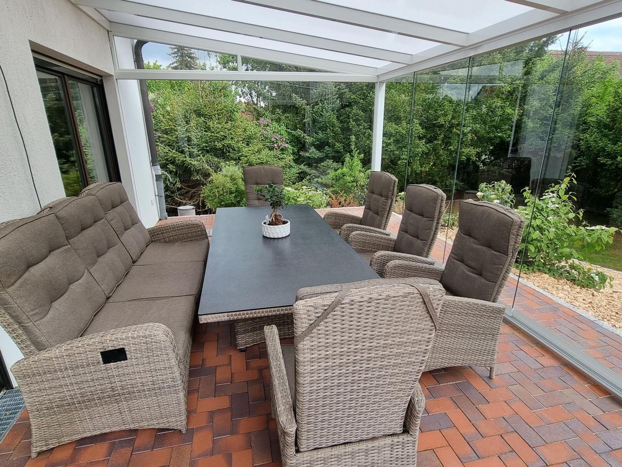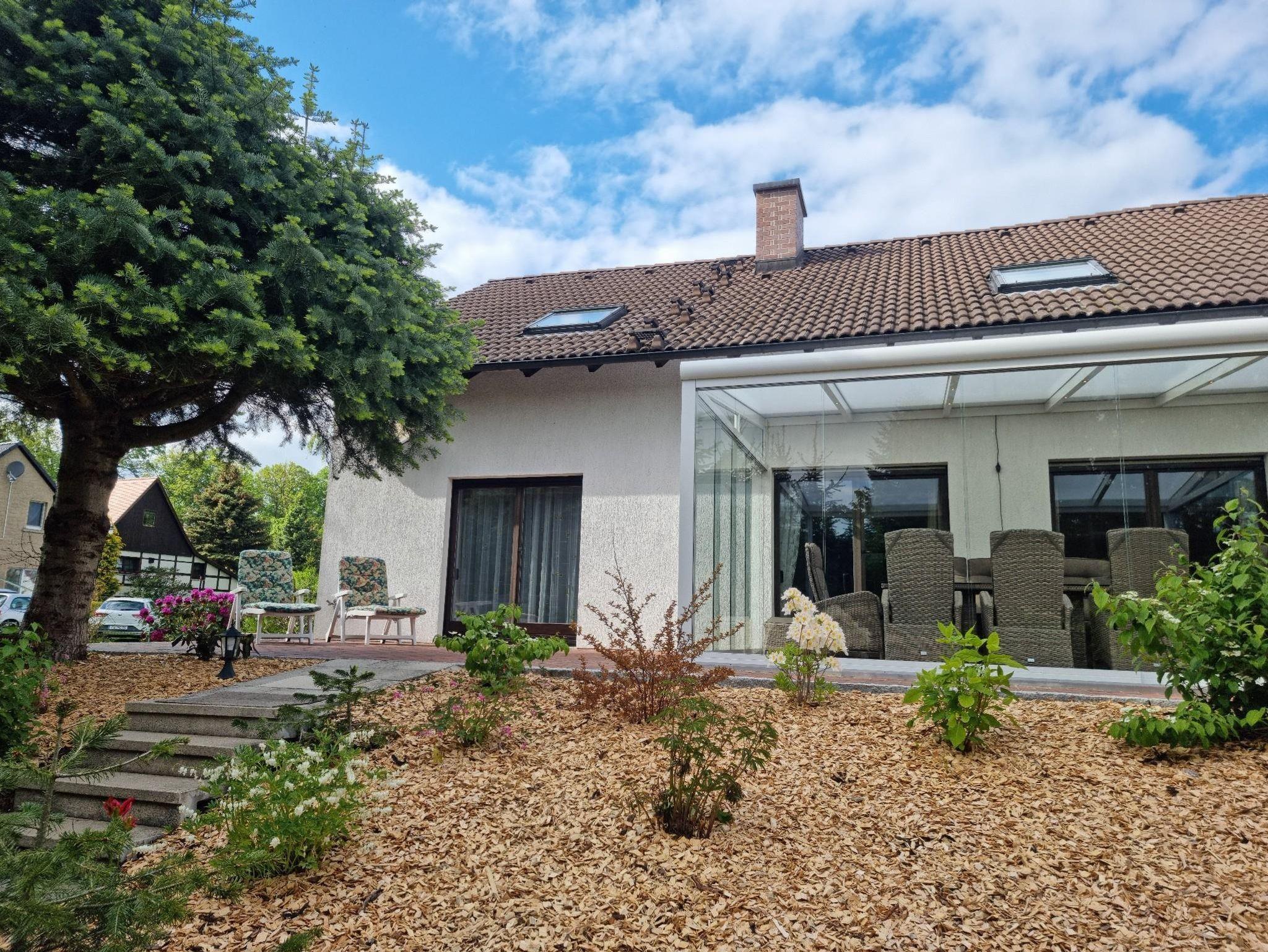 Die Ferienwohnung im Erdgeschoss verfügt über zwei Schlafzimmer, einen großzügigen Wohnbereich mit angeschlossener Terrasse mit Sommergarten, Küche, Bad und Gästetoilette. Außerdem können Sie den Wellnessbereich mit Sauna und Infrarotkabine nutzen.