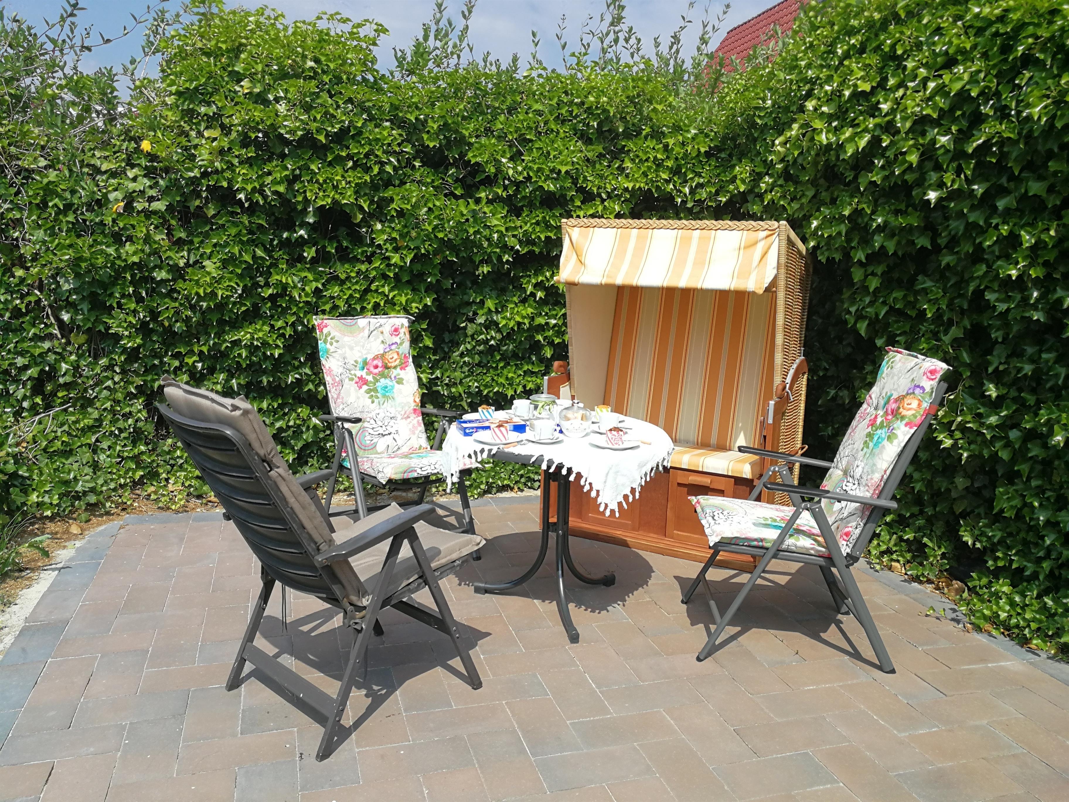 Helle, gemütliche, frisch renovierte Ferienwohnung (85 qm) mit viel Platz und großem, eigenen Garten inklusive Strandkorb, Terrassenmöbel und Grill in ruhiger Lage zu vermieten. Natürlicher Sichtschutz durch hohes Grün, super Privatsphäre!