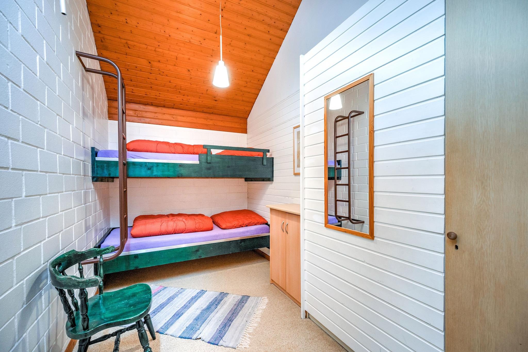 Stueetage: (Indgang , entre, Stue(Fjernsyn(parabol), pejs), åbent køkken(elkedel, brødrister, komfur(Komfur med fire kogeplader, elektrisk), kaffemaskine(kaffetragt), combi-mikroovn, køleskab(+ fryser)), soveværelse(køjeseng(90 x 200 cm)), badeværelse(bruser, håndvask, toilet)) På 1. etage: (soveværelse(dobbeltseng(180 x 200 cm)), soveværelse(køjeseng)) tørretumbler(deles med andre gæster, betalt), vaskemaskine(deles med andre gæster), varme(elektrisk, central), terrasse(20 m2), havemøbler, grill(trækul), parkering, Parasol, sandkasse, legeredskaber, barneseng, barnestol