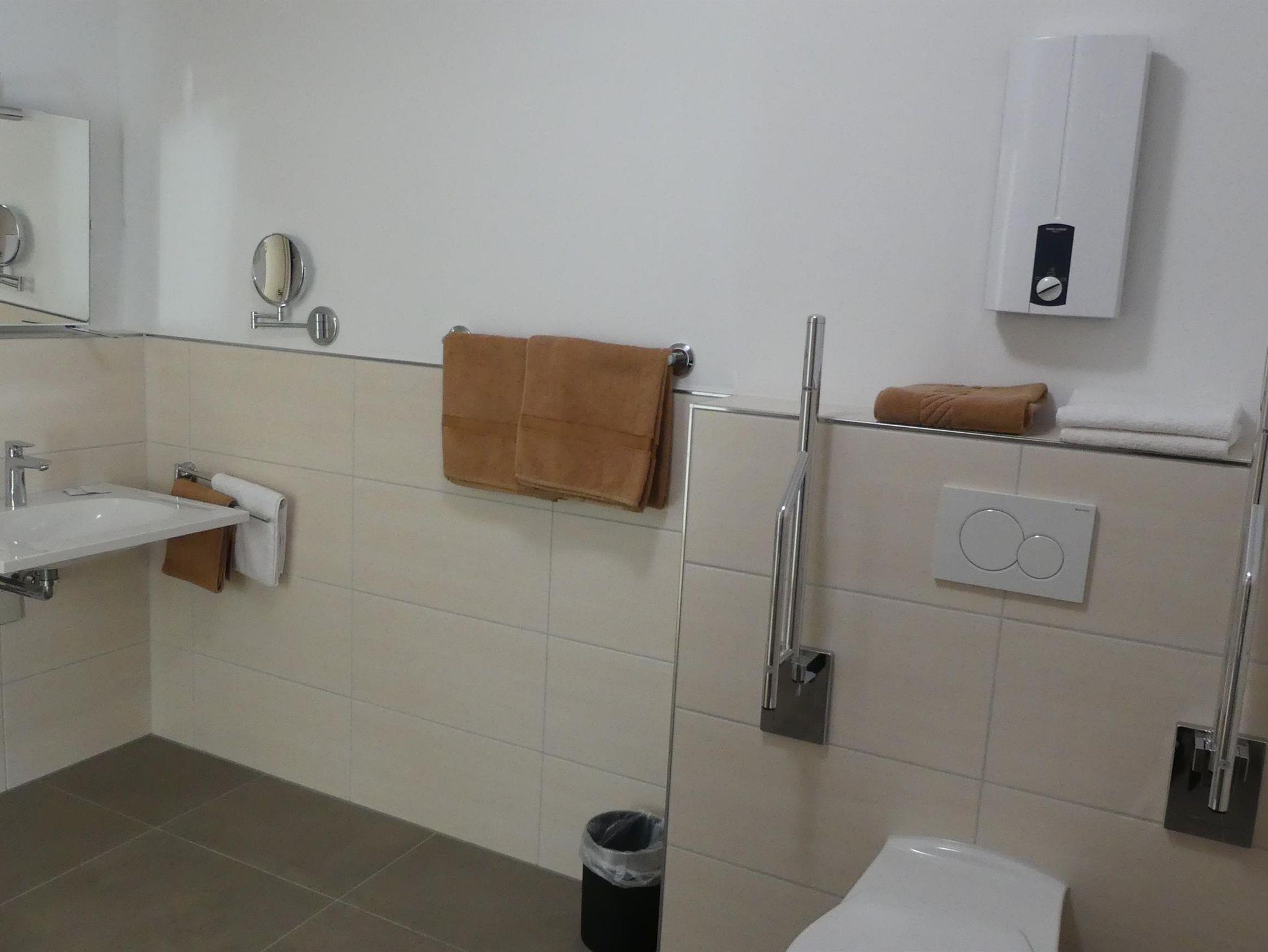 82 qm barrierefreie Ferienwohnung, für Rollstuhlfahrer geeignet, 2 Doppelschlafzimmer, Badezimmer mit DU/WC, Fön vorhanden. Wohnraum mit unterfahrbarer Einbauküche, Kühlschrank mit Gefrierfach, Geschirrspüler, Stereoanlage/SAT-TV/DVD/WLAN, Terrasse und Abstellraum.