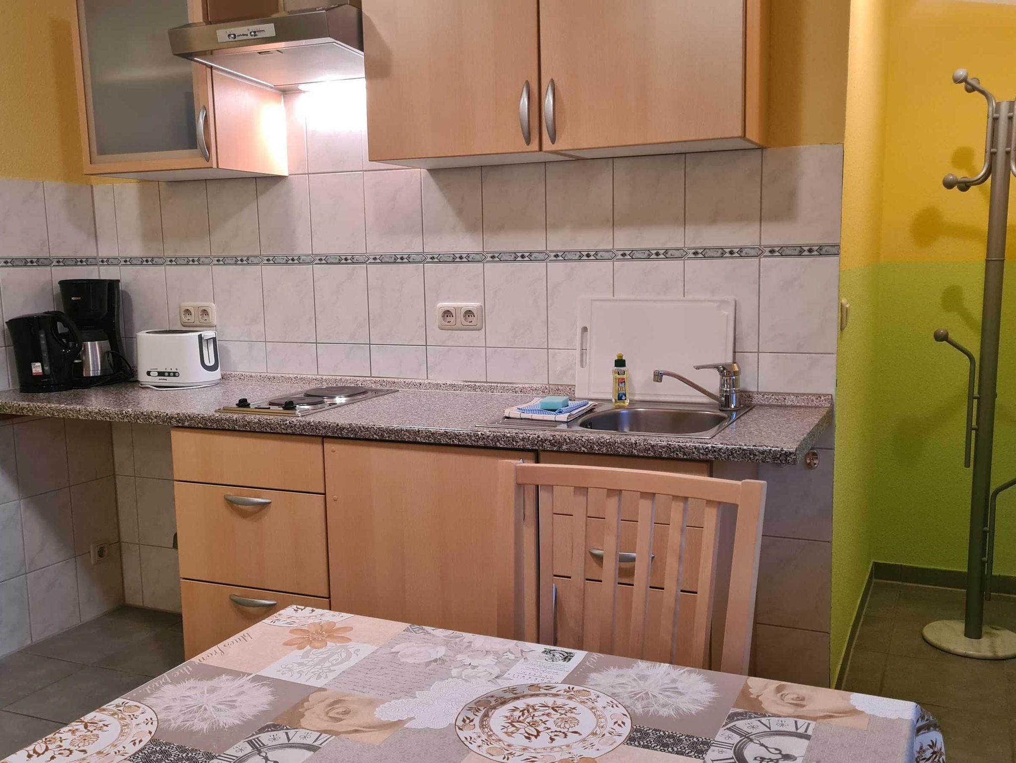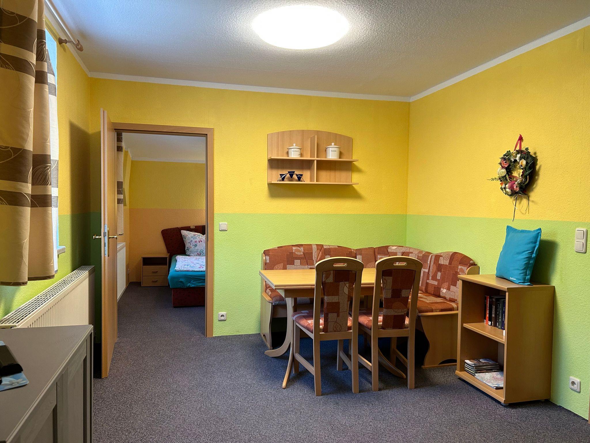 2-Raum-Ferienwohnung in der 1. Etage des Landgasthofes. Kombiniertes Wohn-/Schlafzimmer mit TV, Doppelbett, Pantryküche mit Esstisch, Duschbad/ WC. Internet WLAN und Erstausstattung Bettwäsche und Handtücher inklusive. Sitzecke mit Grill, überdachte Gemeinschaftsterrasse und Parkplatz im Außenbereich am Haus.