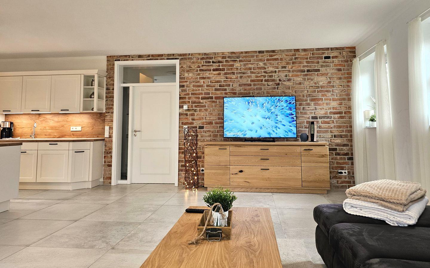 Der große helle Hauptbereich wird durch das gemütliche Wohnzimmer, der erstklassig ausgestatteten Küche, u.a. ThermoMix und dem Essbereich mit einem großen rustikalen Holztisch gebildet. Hier kann gemeinsam gekocht, gegessen, gespielt und gemütlich gechillt werden.