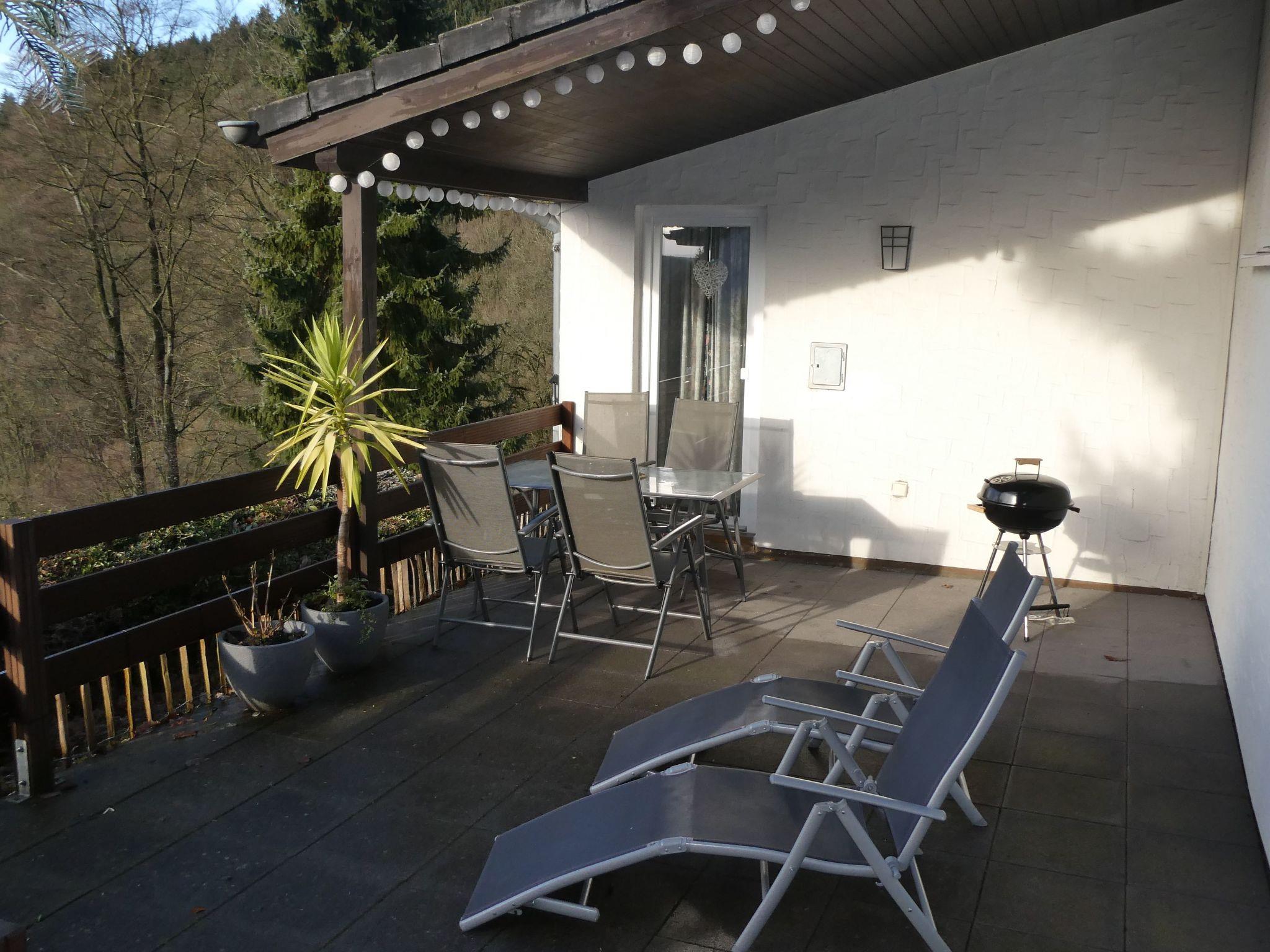 On the partially covered terrace facing south-west, you can enjoy balmy summer evenings with a fantastic view of the lake below. Two loungers and a garden set invite you to sunbathe and linger. A charcoal barbecue is also available here. You can buy wood for the fireplace from us or bring your own. Parking spaces are available free of charge within the holiday home complex. Pets are also very welcome.