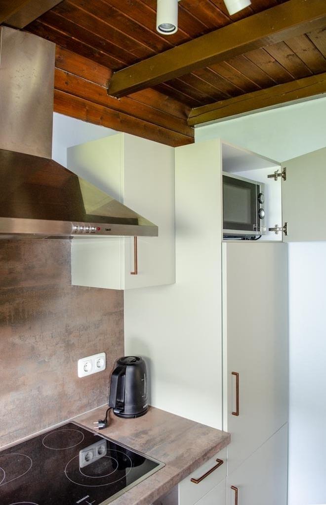 Das Cottage verfügt über eine vollausgestattete Küche, einen separaten Wohn- und Essbereich, der durch die Split-Level-Anordnung ein entspanntes Raumgefühl aufkommen lässt, ein modernes Bad mit großzügigem Duschbereich und einen Abstellraum mit Waschtrockner. WLAN wird ebenfalls bereitgestellt.