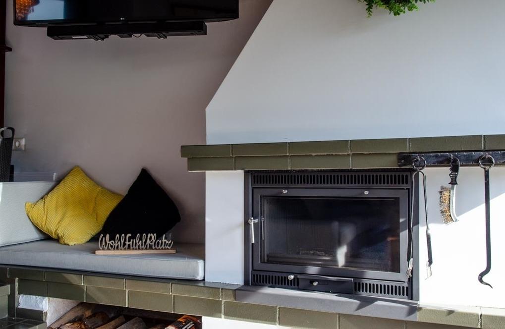 Die an das Wohnzimmer angeschlossene und mit bequemen Gartenmöbeln und einem Terrakottaofen ausgestattete Terrasse lädt mit ihrer Südlage ebenfalls zum Erholen oder zu entspannten Grillabenden ein.