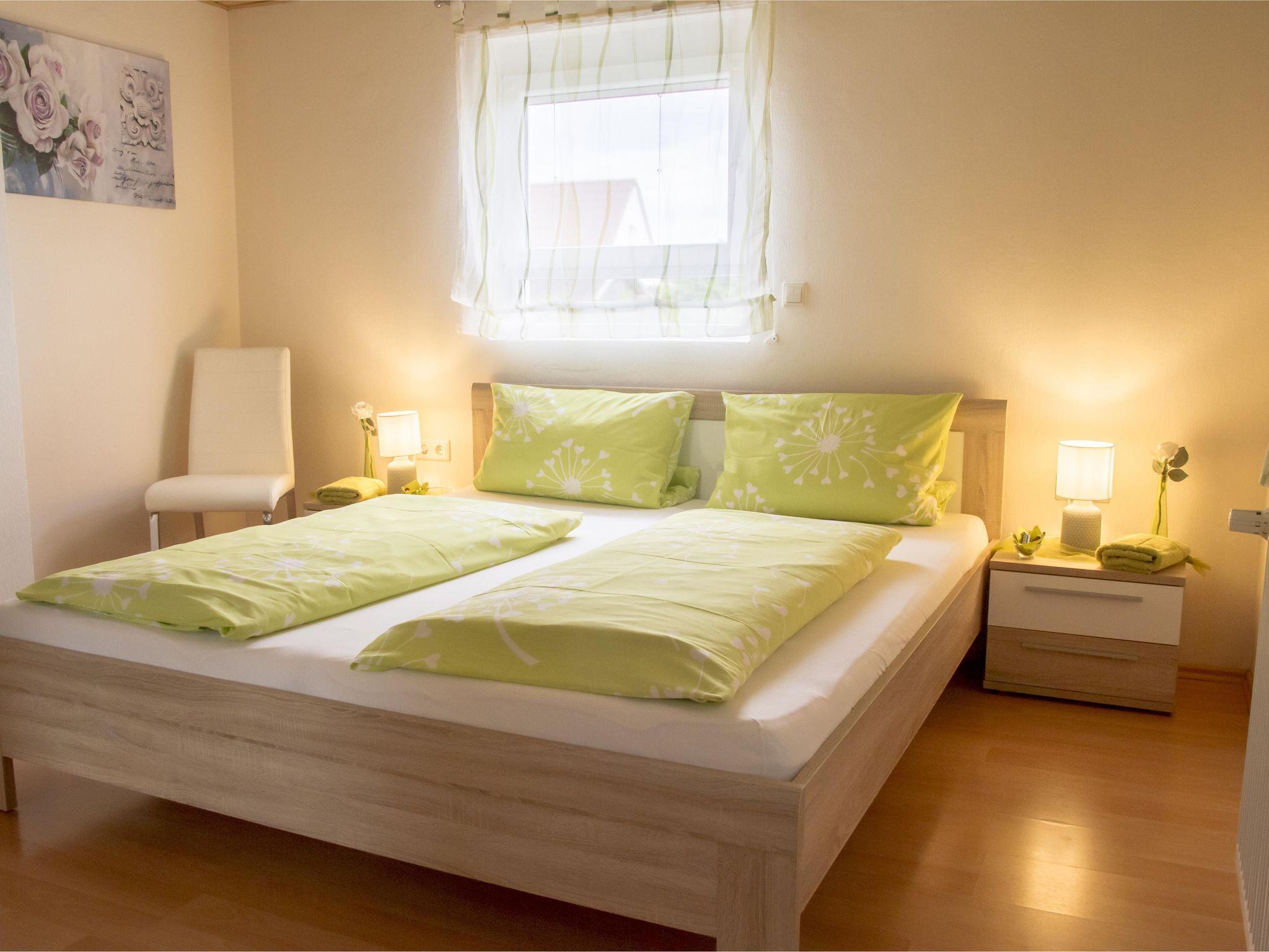 Die Wohnung verfügt über ein Schlafzimmer mit einem großen Bett und einem Spiegelschrank. Des Weiteren befindet sich auf einem der beiden Nachtkonsolen ein Radiowecker. Außerdem dienen zwei Stühle zur Kleiderablage. Eine Reisebett sowie ein Hochstuhl für ein Kleinkind stehen auf Anfrage zur Verfügung.