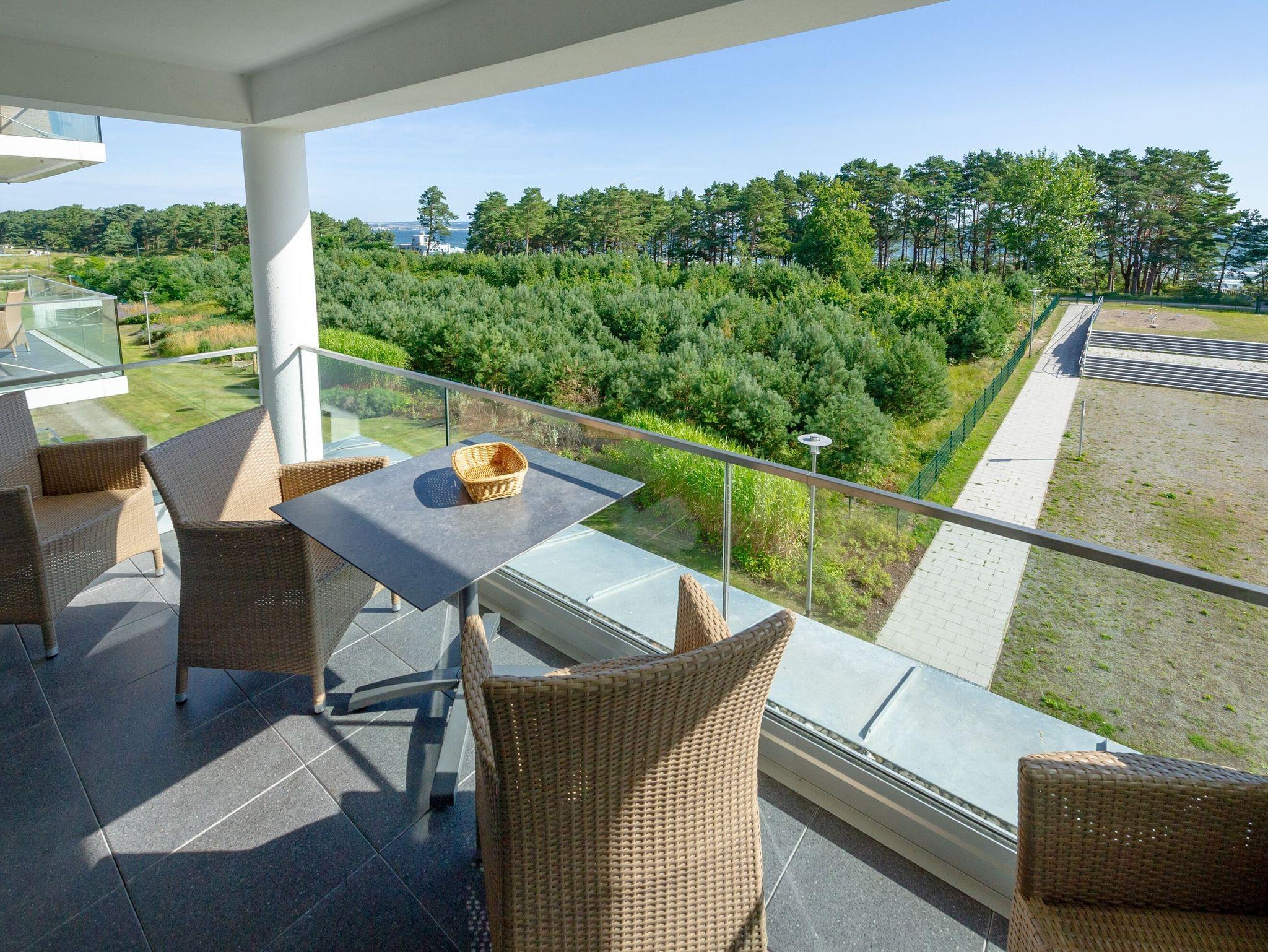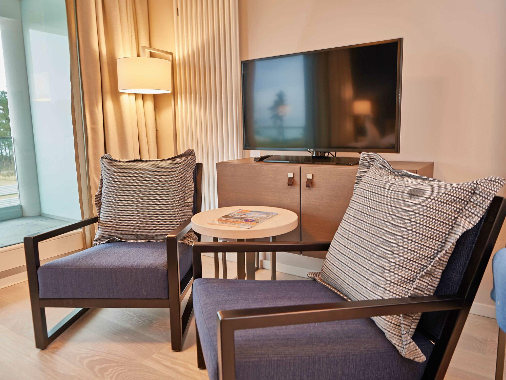 Die Wohnung verfügt über einen modern ausgestatteten Wohn-/Essbereich mit kleiner Sitzecke, einen Flachbild-TV, ein Radio mit USB-Anschluss, Bluetooth und Internet sowie ein komfortables Boxpringbett (1,80 x 2,00 m). Vom großen Balkon und sogar vom Bett aus können Sie die Weite der Ostsee genießen. Die Balkonmöbel stehen ganzjährig zur Verfügung.