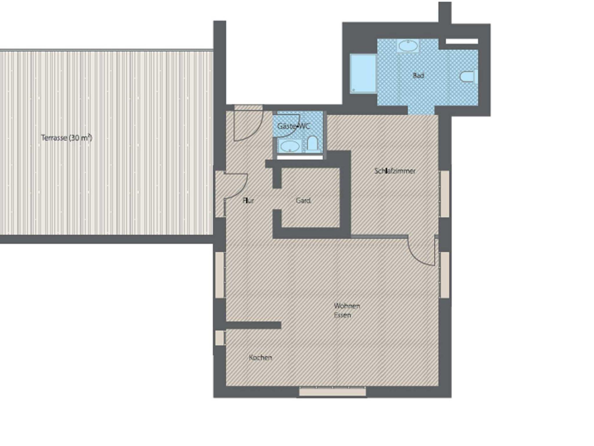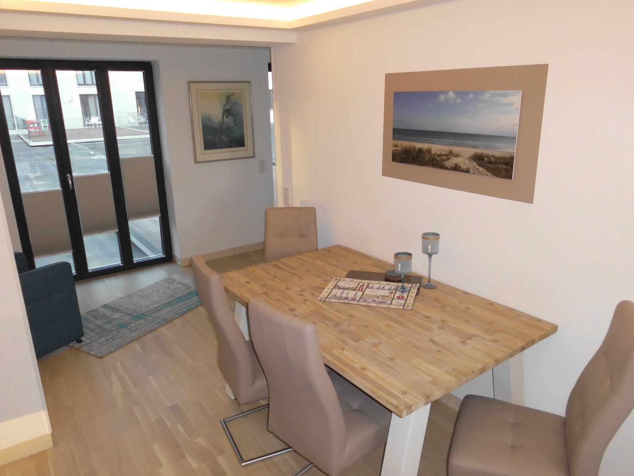 Besonders für Sonnenhungrige ist diese Wohnung mit 68 qm ideal: eine 30 qm große Dachterrasse, mit eigenem Strandkorb, erstreckt sich vor dem Wohnbereich.