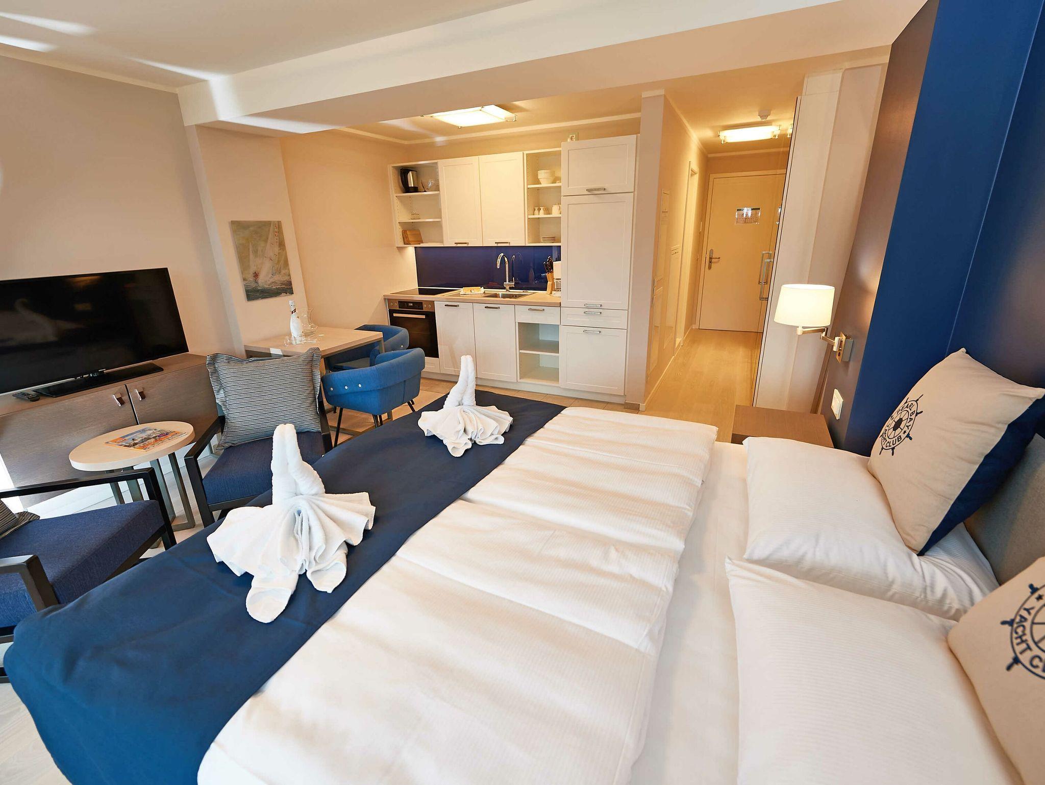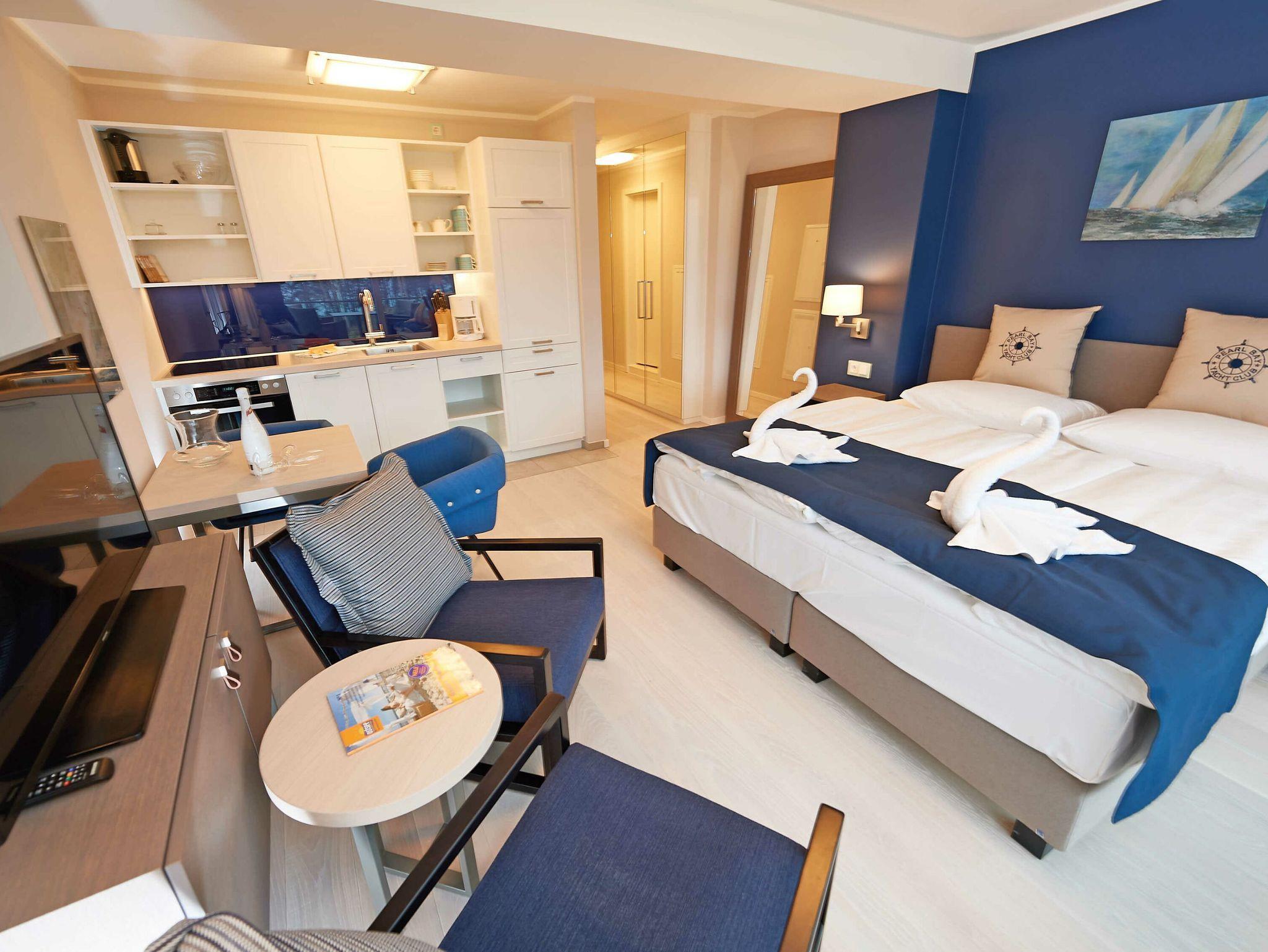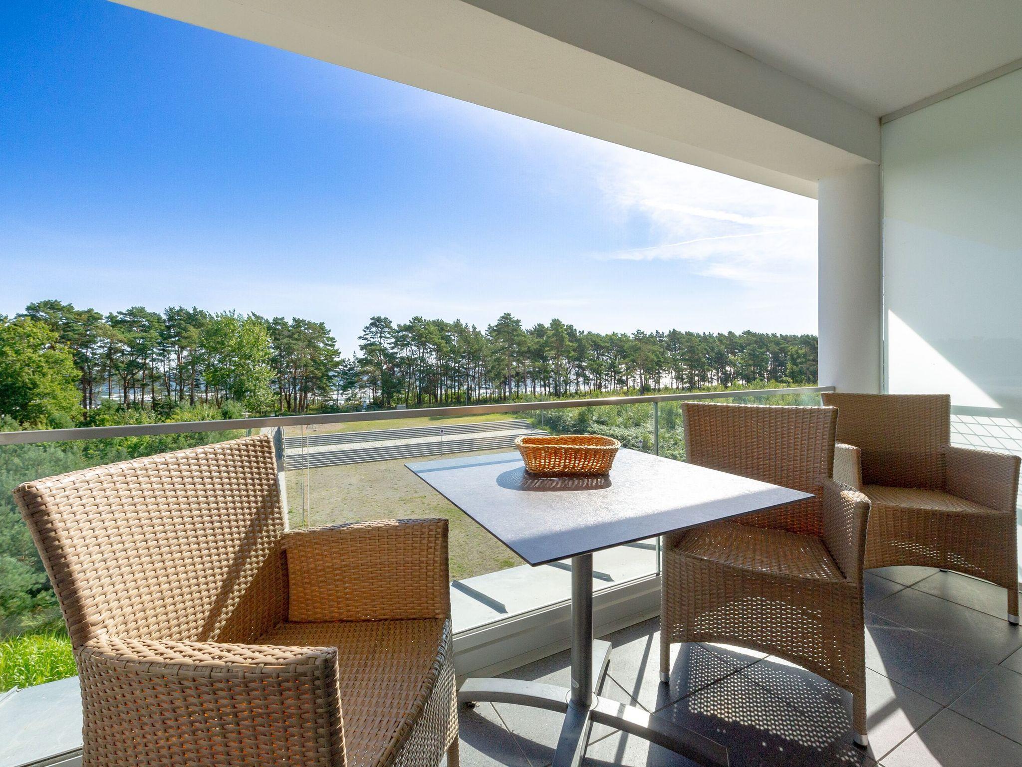 Die Wohnung verfügt über einen modern ausgestatteten Wohn-/Essbereich mit kleiner Sitzecke, einem Flachbild-TV, einem Radio mit USB-Anschluss, Bluetooth und Internet sowie einem komfortablen Boxpringbett (1,80 x 2,00 m). Vom großen Balkon und sogar vom Bett aus können Sie die Weite der Ostsee genießen. Die Balkonmöbel stehen saisonal - in der Regel von Mai bis Ende September - zur Verfügung.