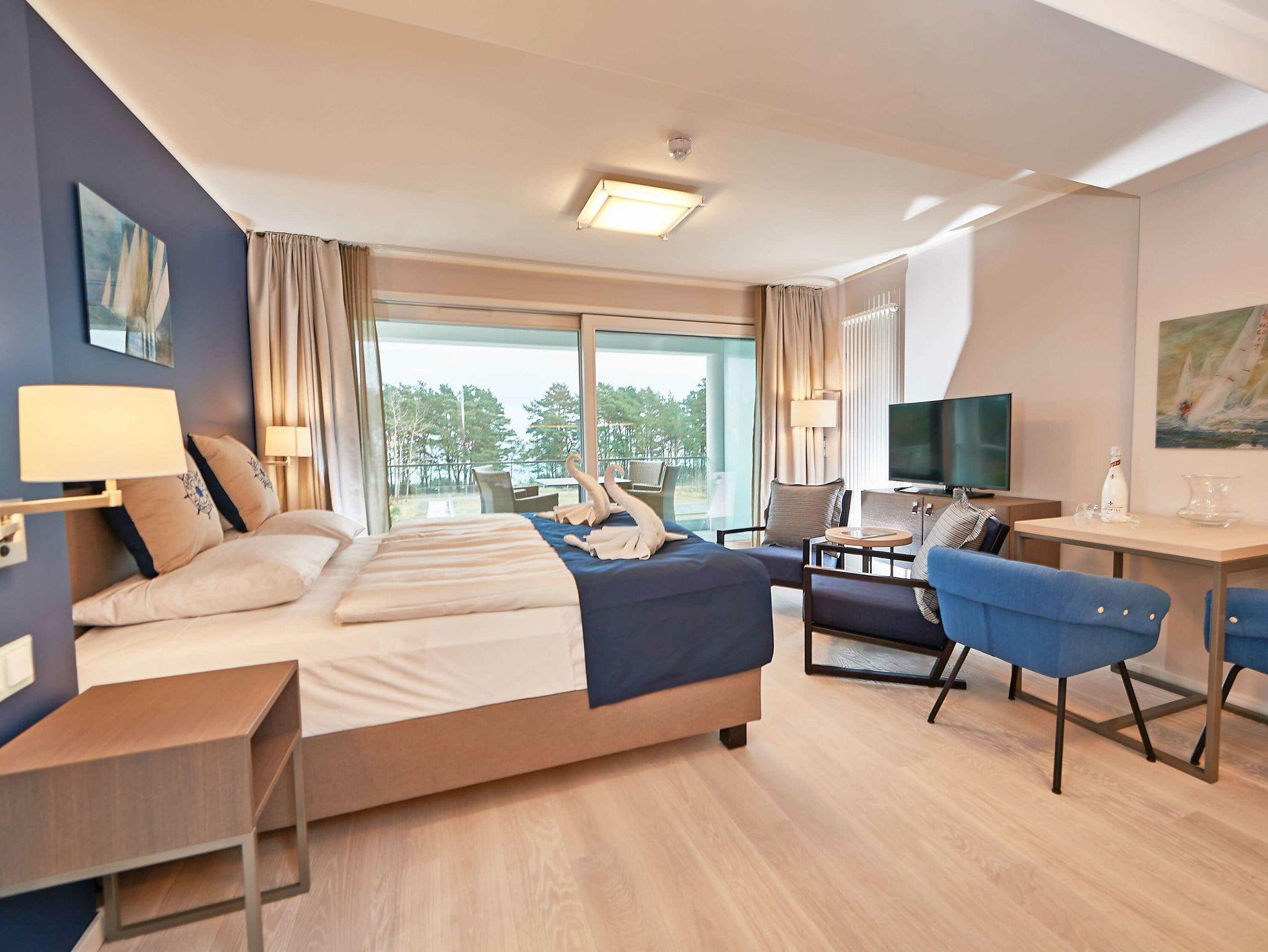 Unser Tipp: Im selben Gebäude befindet sich auch das DORMERO Strandhotel Rügen. Dort können Sie gegen eine gesonderte Tagesgebühr den Fitness- und Wellnessbereich mit zwei Saunen, Dampfbad, großem Pool, Kinderpool, Ruheräumen, einem gut ausgestatteten Trainingsbereich sowie Umkleiden und Duschen mit benutzen.
