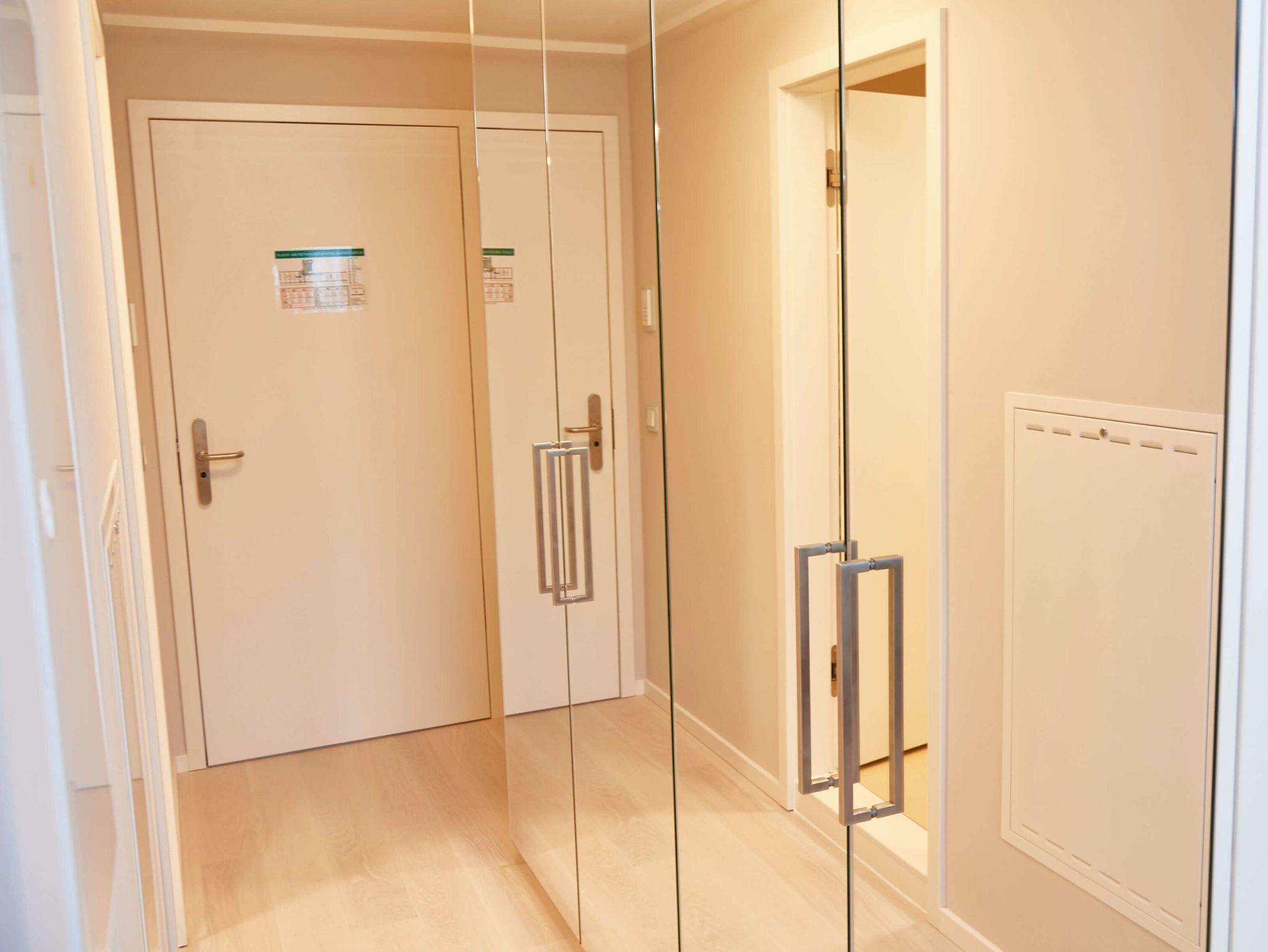 Die Wohnung verfügt weiterhin über ein modern gefliestes Badezimmer mit bodengleicher Dusche sowie eine Infrarotkabine der Marke Tylö für zwei Personen.