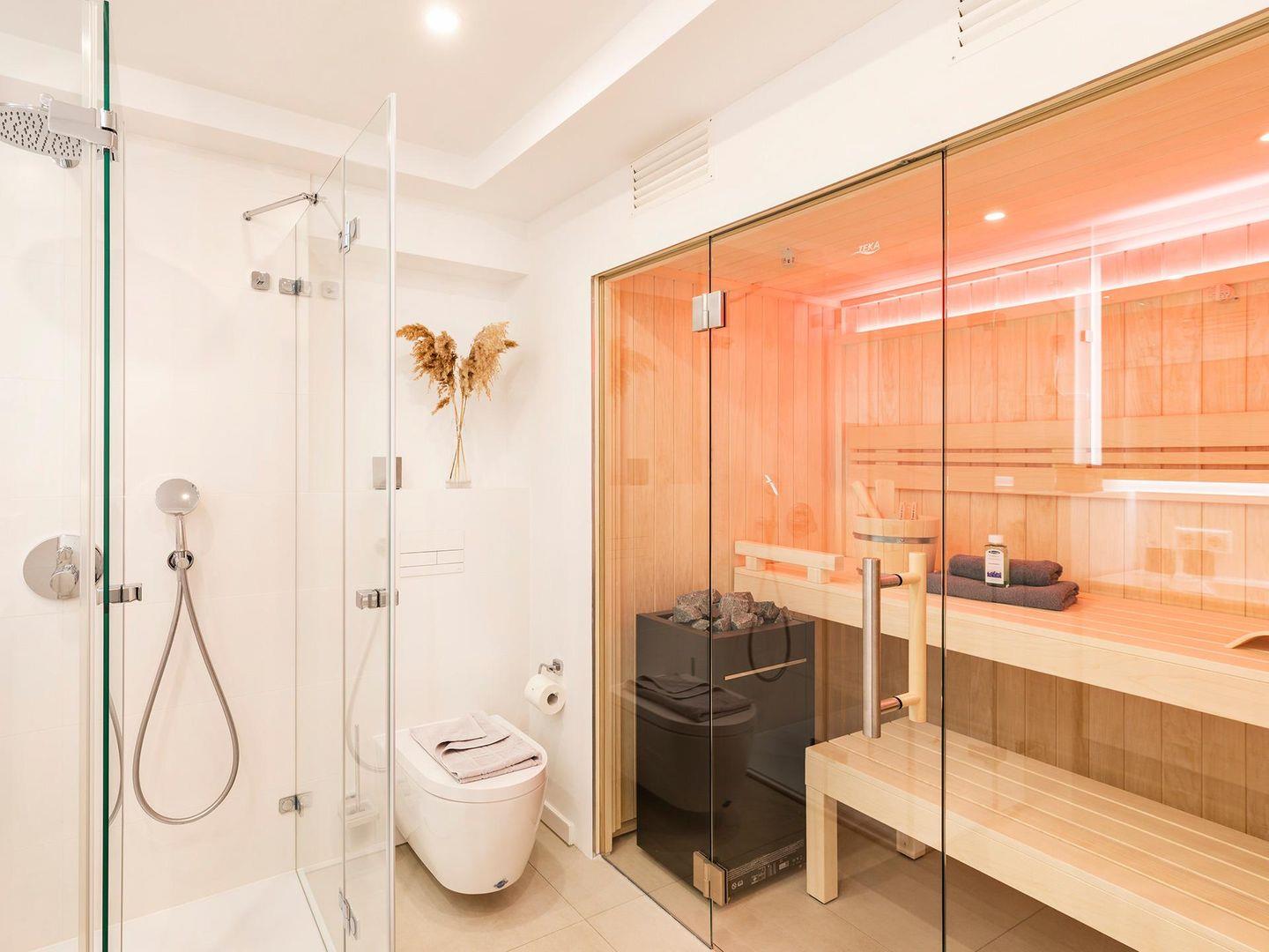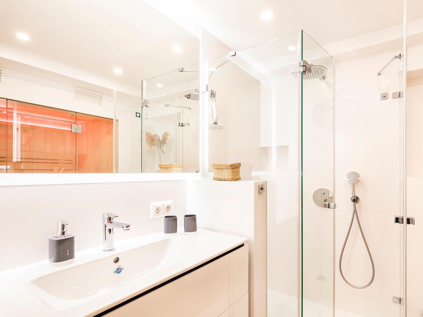 - Badezimmer 1: Sauna, Regendusche, WC, Waschbecken, Haartrockner