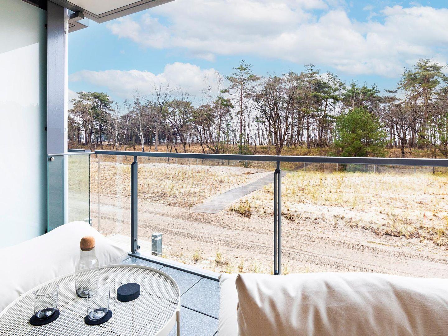 - Terrasse mit Sitzmöglichkeit und Blick Richtung Dünenlandschaft und Ostsee
