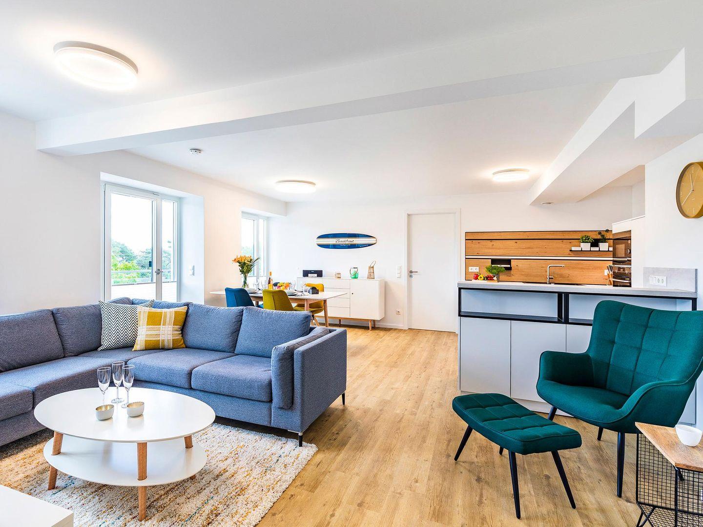 Wohn- und Esszimmer mit offener Küche und Balkon mit Blick in Richtung Ostsee