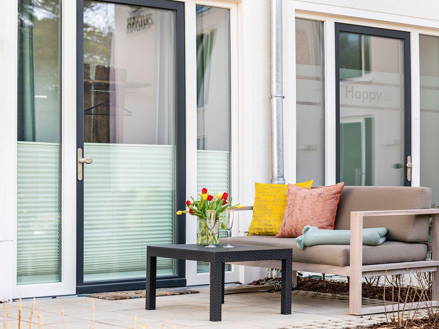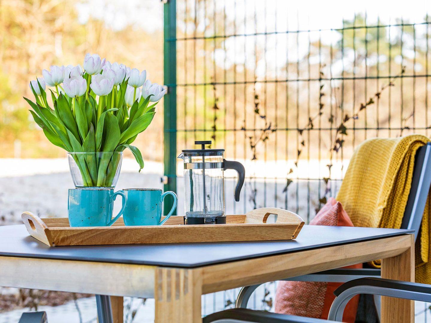 - Terrasse mit Tisch und 4 Stühlen, Blick auf die Dünenlandschaft
