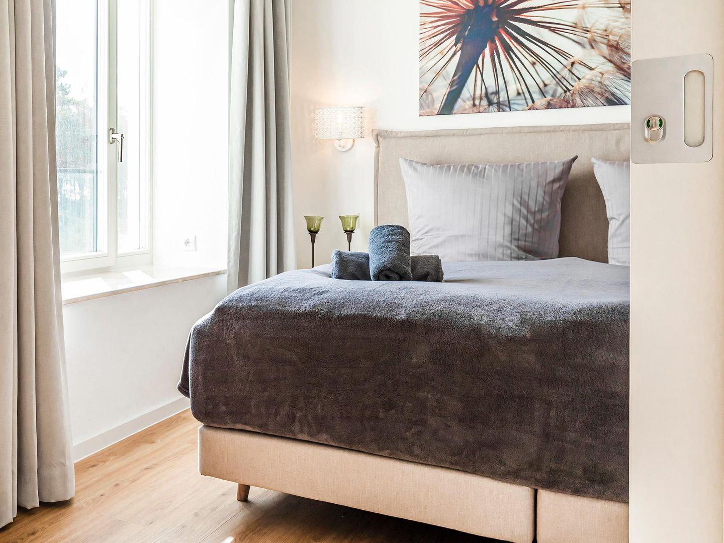 Hinter dieser Ferienwohnung im 1.Obergeschoss des Hauses "Hiddensee", verbirgt sich eine liebevoll, ausgestattete Nichtraucherwohnung. Dort heißt man Sie rechtherzlich willkommen und lädt Sie ein, den Stress des Alltages zu vergessen. Hier werden Träume war - mit Blick zum Meer. Durch bodentiefe Fenster können Sie das Schauspiel der Wellen beobachten und das Wiegen der Bäume im Wind. Es wird Ihnen ein Lächeln auf die Lippen zaubern. Dieses komfortable Ferienzuhause teilt sich auf in: zwei Schlafzimmer, die Platz für vier Personen oder - eine Familie mit zwei Kindern bieten, mit je einem Flachbild-TV, zwei separate moderne Duschbäder mit WC lassen Raum für Privatsphäre, ein Wohn -und Essbereich lässt die Familie zusammenkommen, gleich nebenan, in Sichtweite, können Sie köstliche Speisen in einer modernen Küche zubereiten. Kostenfreier WLAN-Zugang ist selbstverständlich. Hunde sind ebenfalls herzlich willkommen.