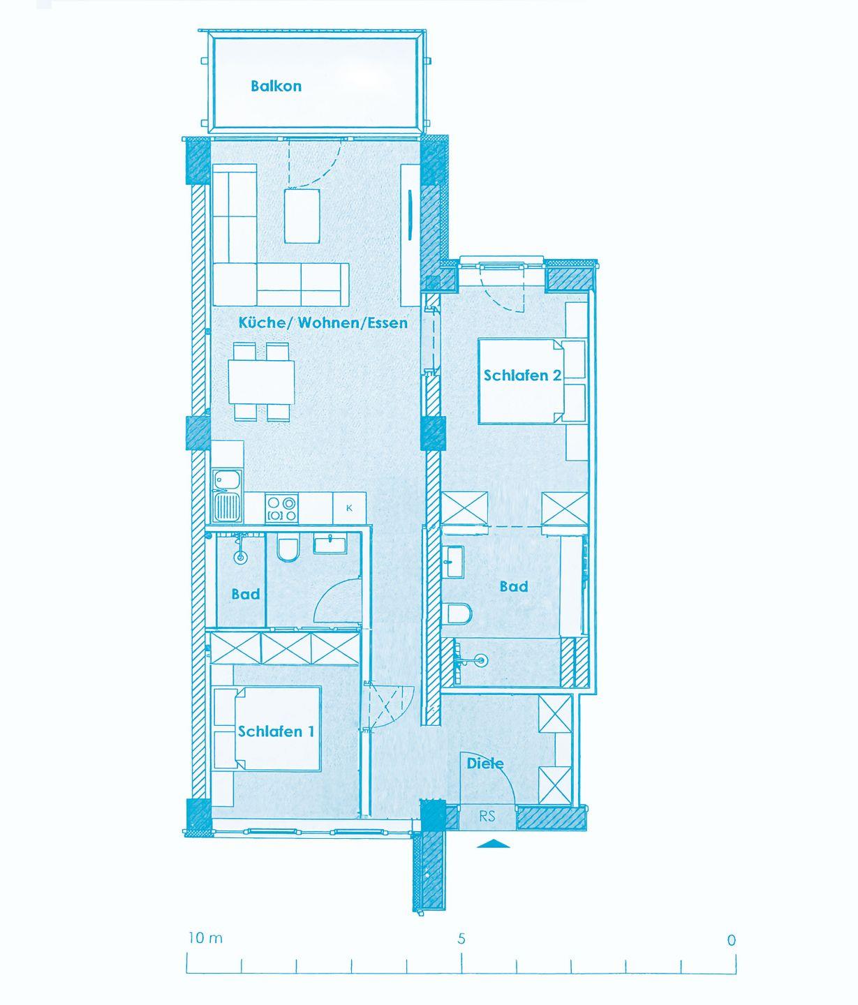 - Wohn/Essbereich: Sofa, Sitzbereich, Essbereich, Flach-TV, Balkon Zugang