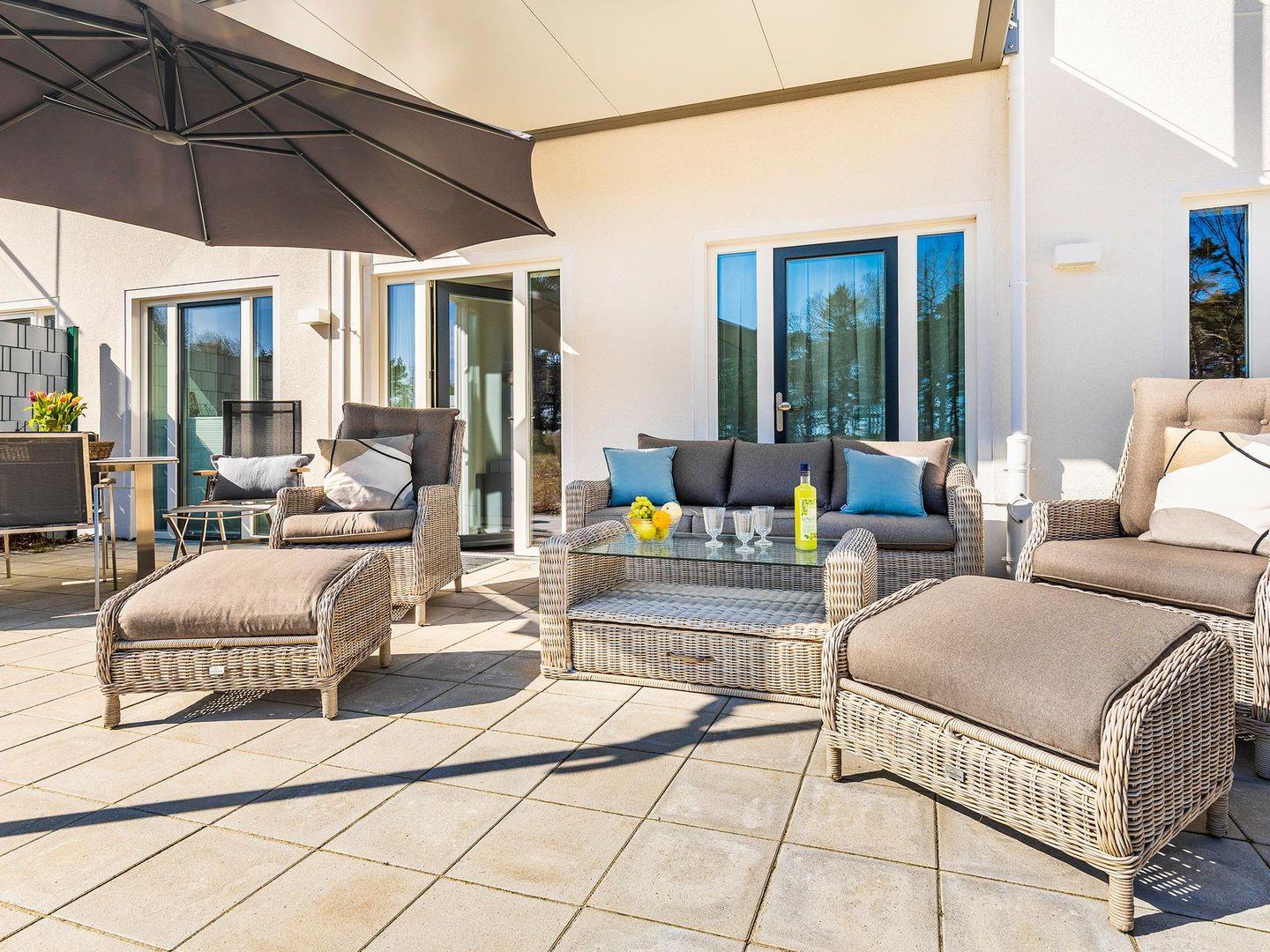 - Terrasse (Landseite) mit dem Strandkorb