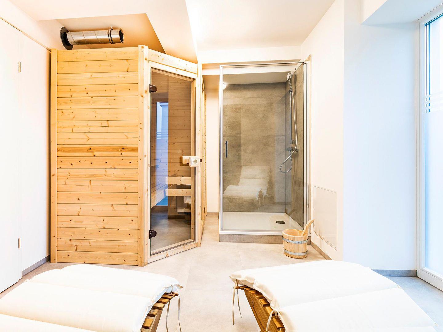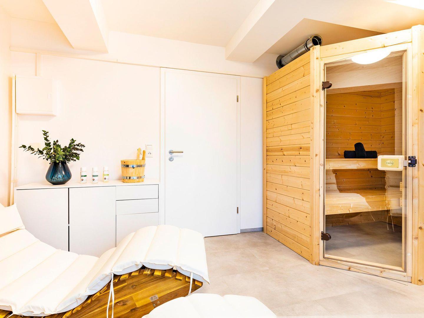 - Private Sauna mit 2 Liegen und mit Dusche in Abstellraum 2. OG, mit Blick Richtung Binnenseite