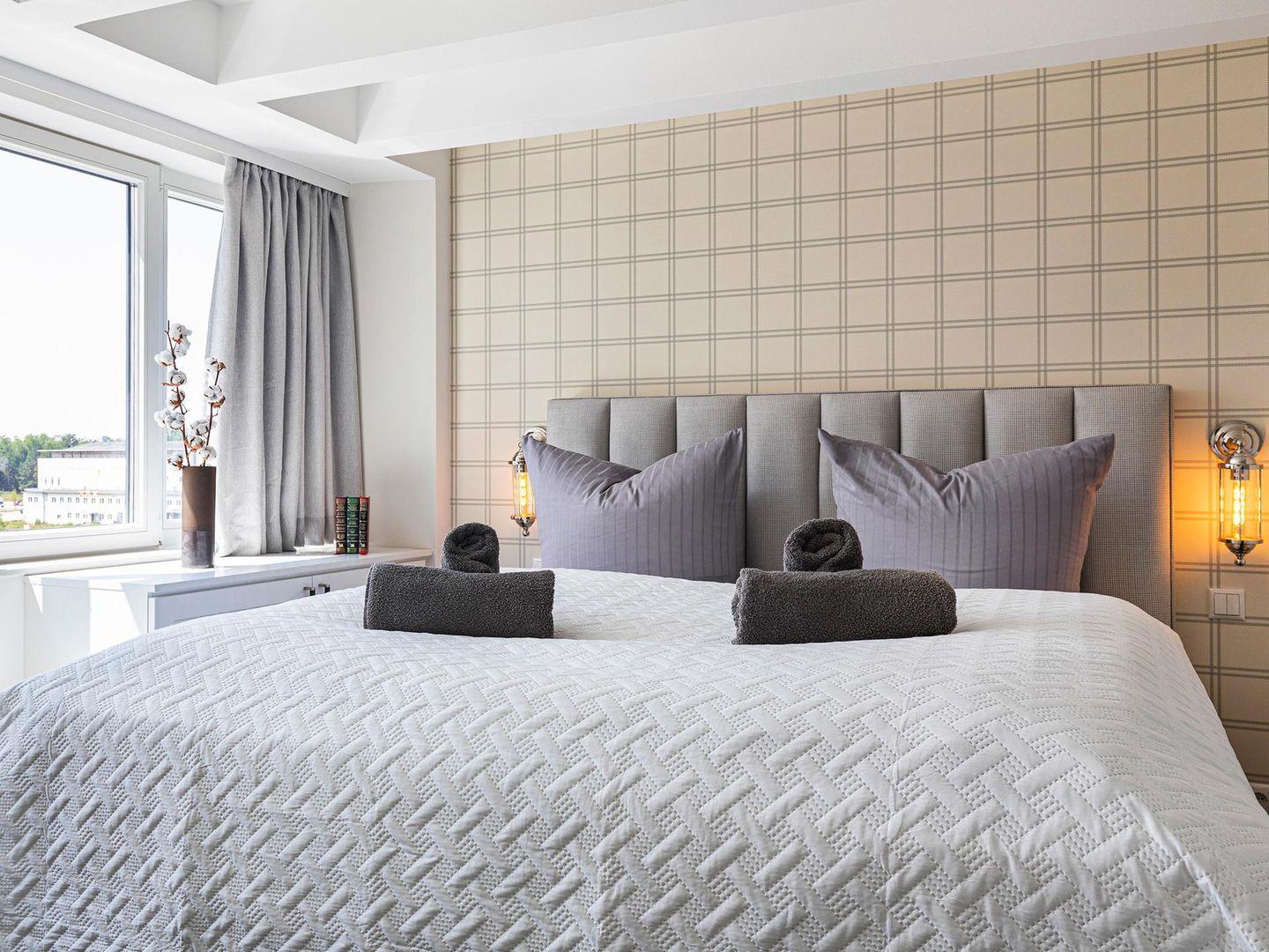 Eine freistehende Badewanne befindet sich neben dem gemütlichen Boxspringbett im Schlafzimmer, so dass Sie bei einem entspannenden Schaumbad den wunderschönen Ausblick genießen können. Parken können Sie vor dem Haus auf dem hauseigenen Parkplatz und mit dem Aufzug gelangen Sie bequem in die vierte Etage.