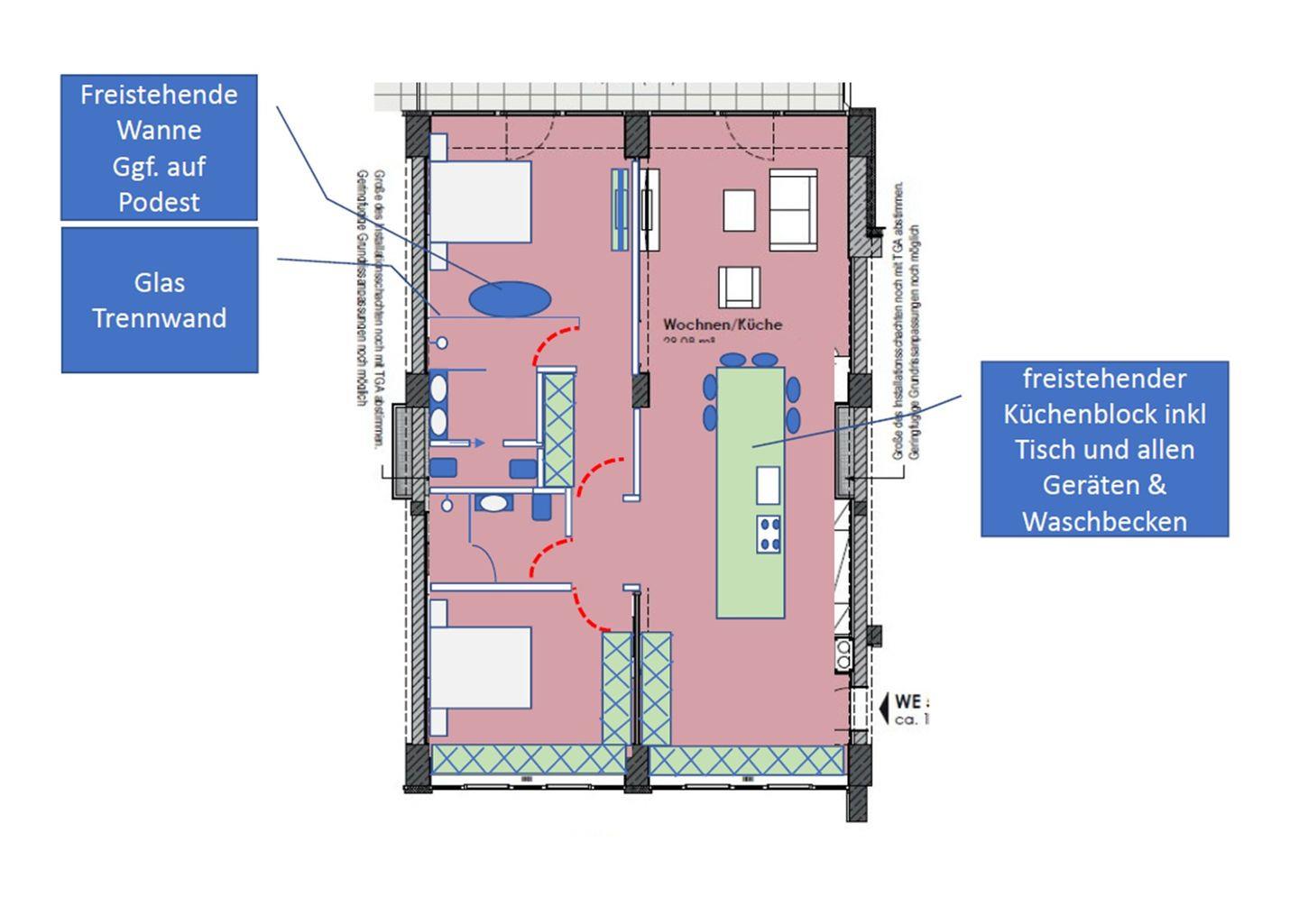 - Schlafzimmer 1: Doppelbett (180x200), TV, freistehende Badewanne, Zugang zum Balkon