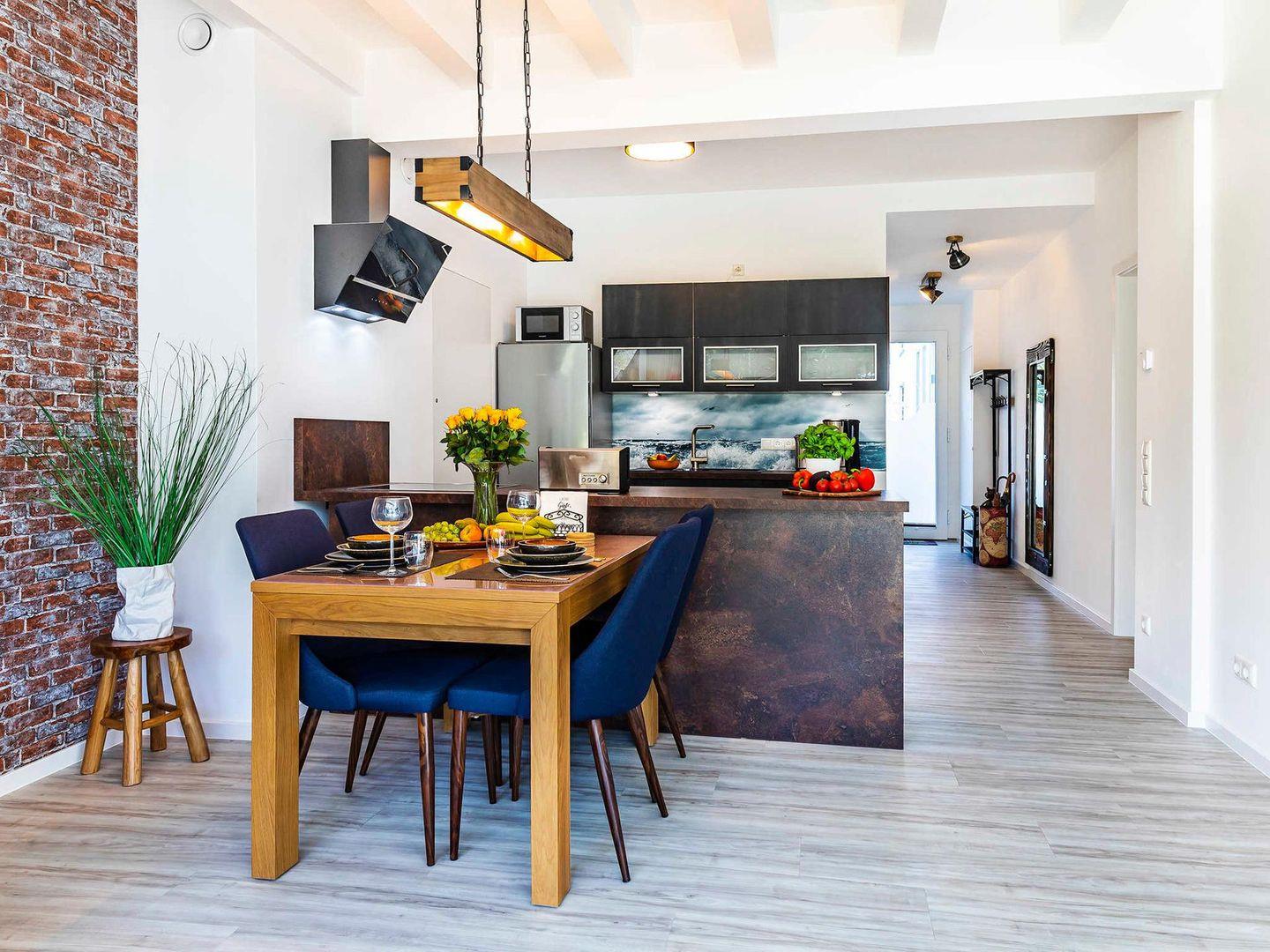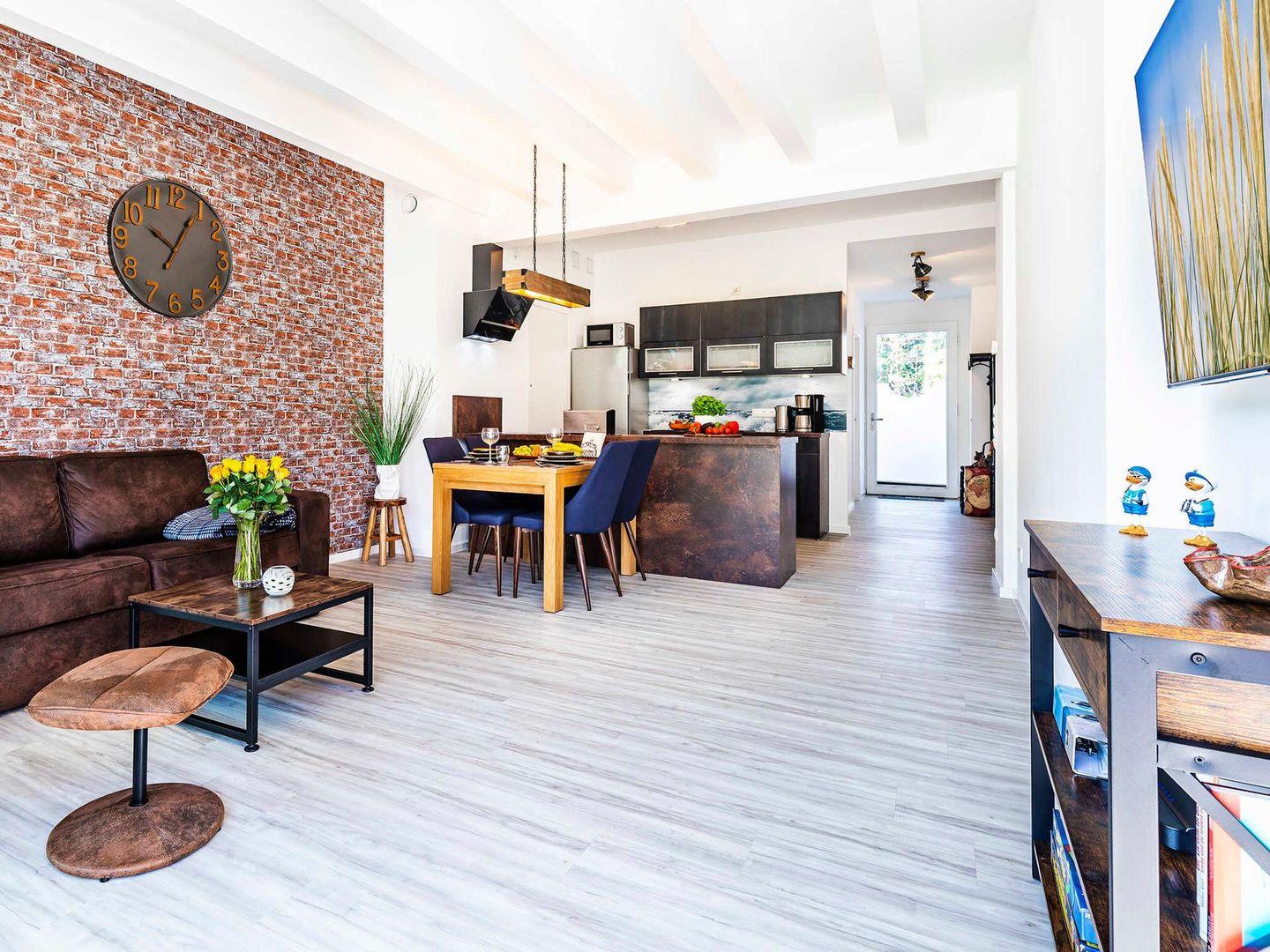 - Küche: offene Küche, Kühlschrank, Backofen, Spülmaschine, Geschirr/Besteck, Kochutensilien, Toaster, Mikrowelle, Filterkaffeemaschine und Kapsel-Kaffeemaschine (Cafissimo)