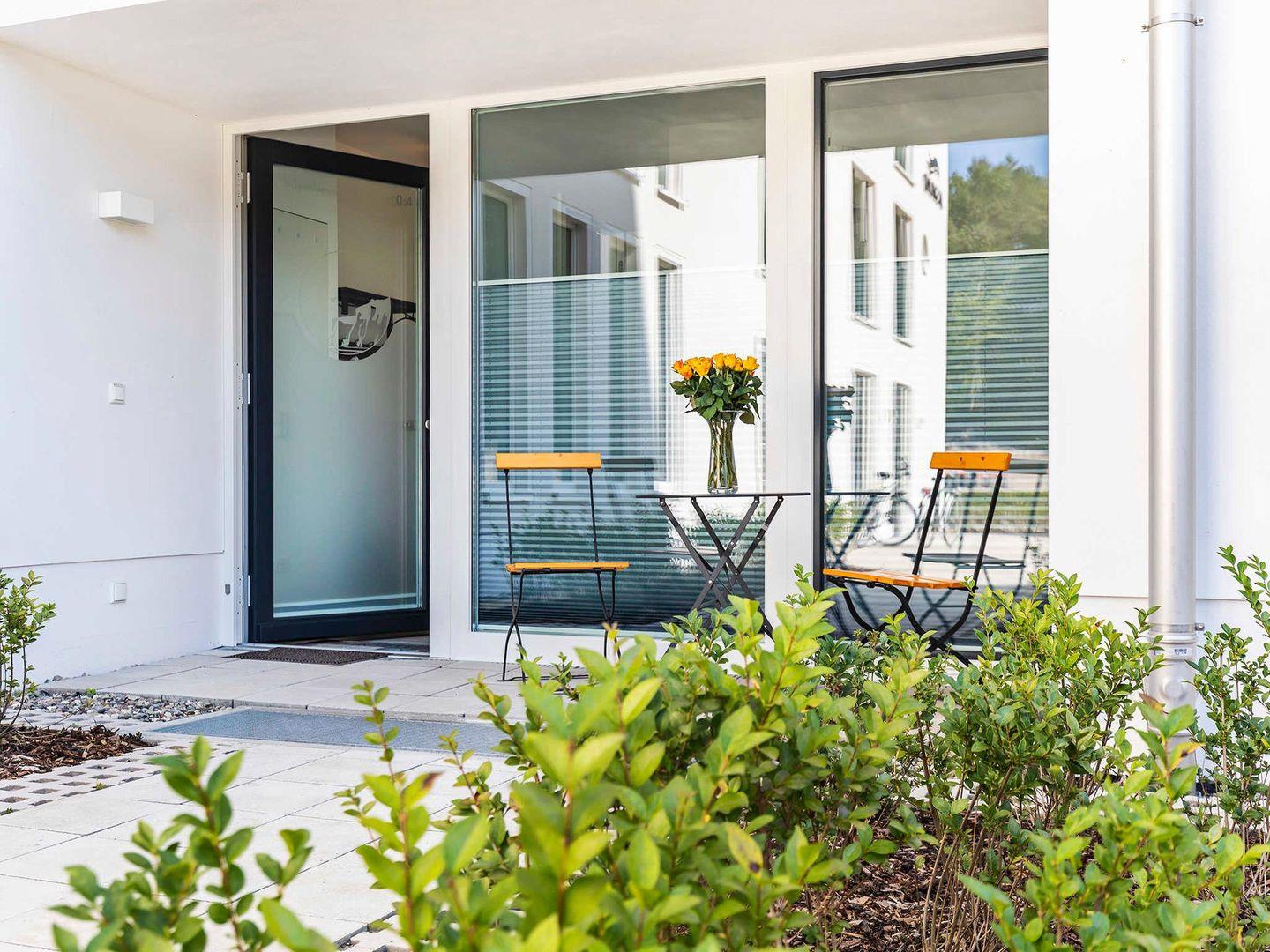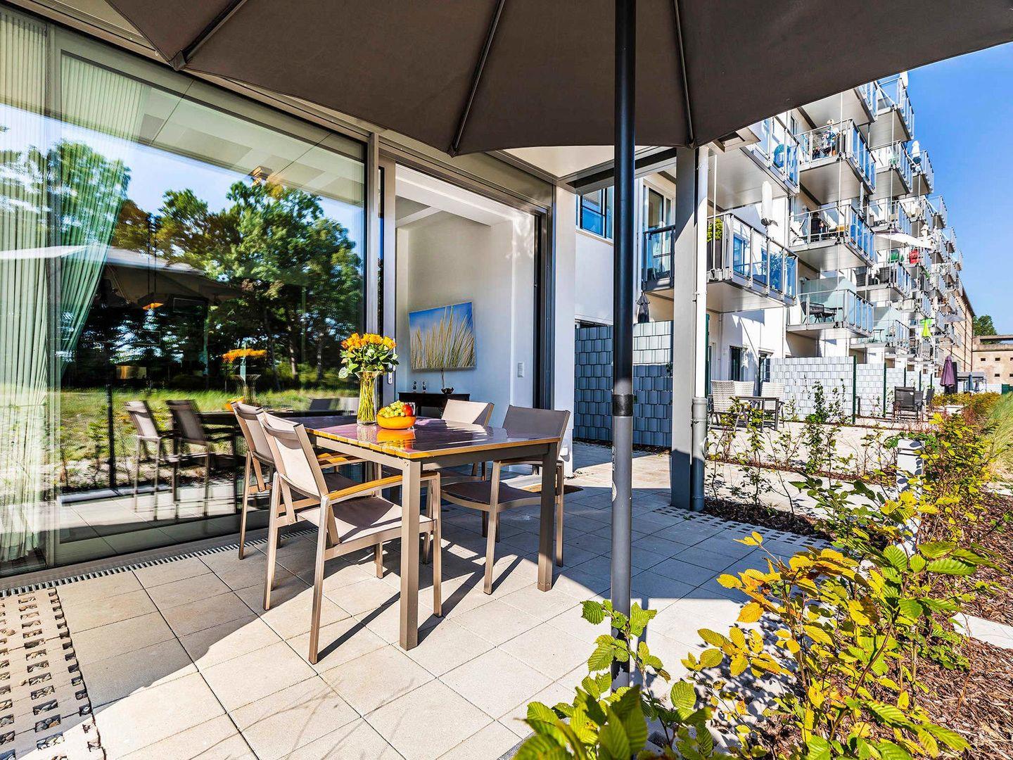 Die Wohnung liegt im Erdgeschoss und verfügt über eine Terrasse zur Dünen-/Meerseite sowie eingangs-/promenadenseitig einen kleinen Vorplatz. Von der seeseitigen Terrasse führt ein hauseigener Zugang in wenigen Schritten über die bewaldete Düne zum breiten, langen Sandstrand der Prorer Wiek. Am Strand erwartet Sie ein Strandkorb. Entspannter und komfortabler kann Strandurlaub nicht sein!