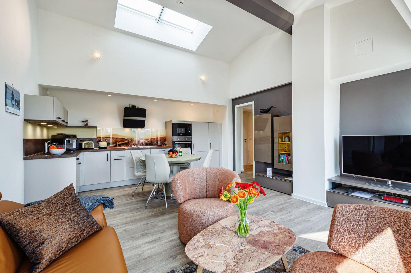Es erwartet Sie eine schöne, helle moderne Ferienwohnung im 5. OG mit Loft - Feeling, Dachfenster und Balkon zur Seeseite, einer Gemeinschaftssauna sowie Gemeinschaftsdachterrasse mit einem wunderschönen Ausblick.