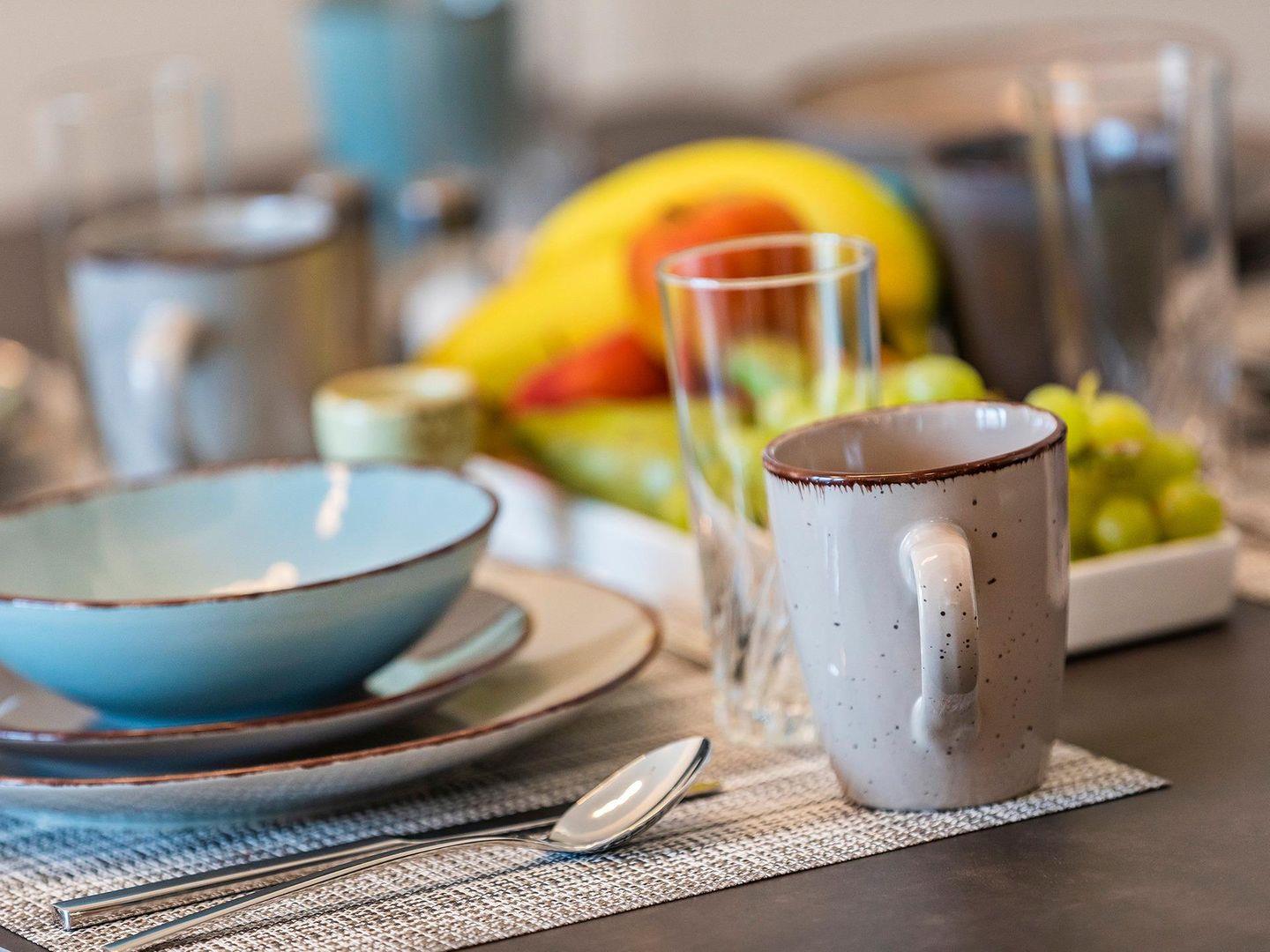 - Küche: offene Küche, Kühlschrank, Backofen, Spülmaschine, Geschirr/Besteck, Kochutensilien, Toaster, Mikrowelle, Filter- und Nespresso-Kaffeemaschine mit Kapseln