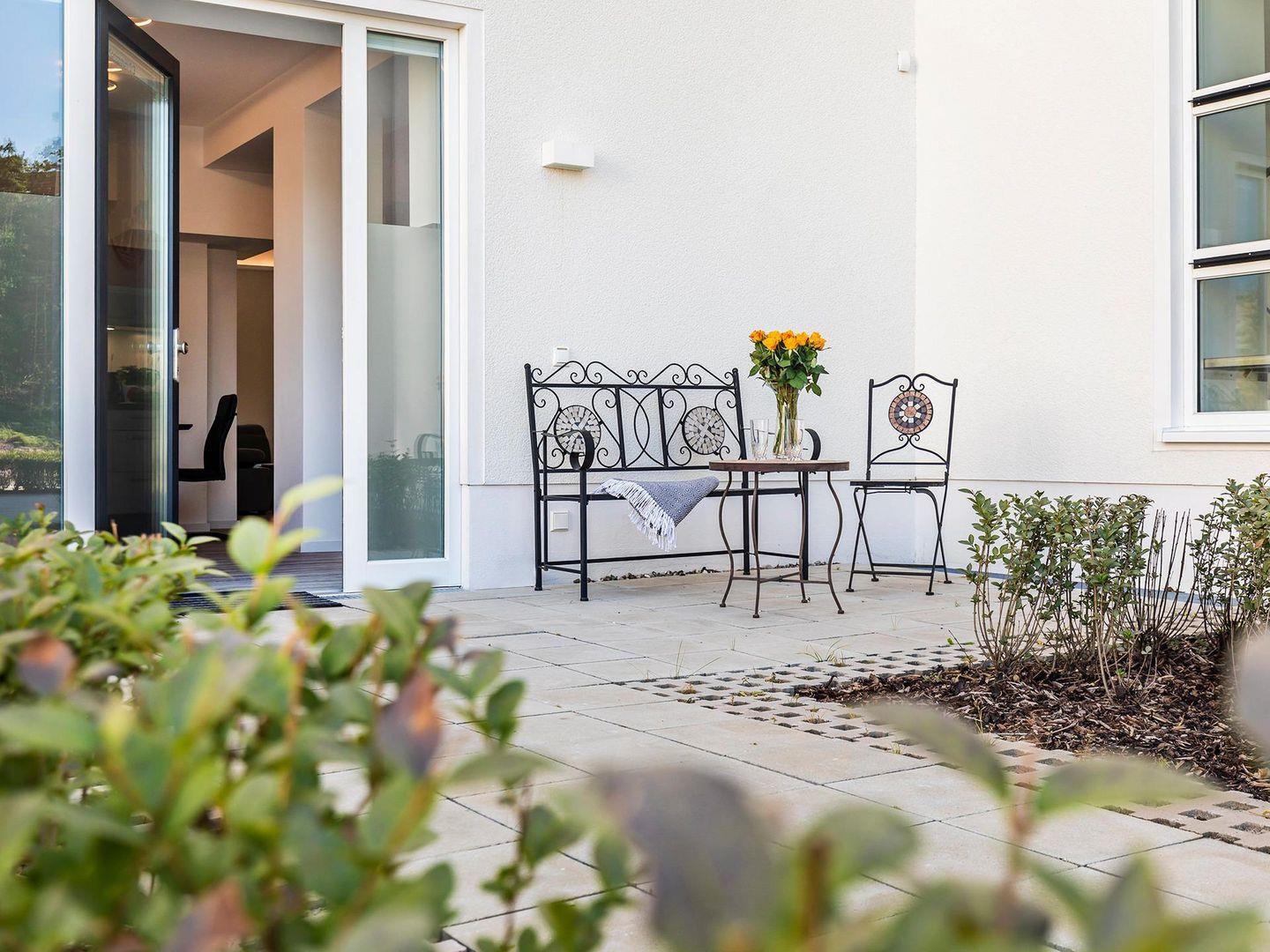 - Terrasse 2: großer Tisch, 6 Stühle, Sonnenschirm und Strandkorb, Seeseite