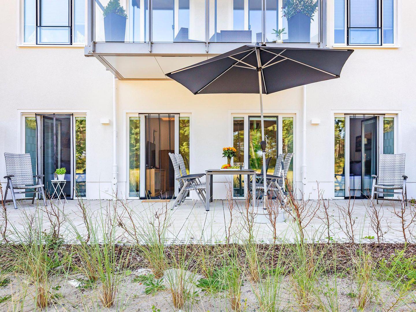 Die Wohnung liegt im Erdgeschoss und verfügt über eine sehr große Terrasse zur Dünen-/Meerseite sowie eingangs-/promenadenseitig einen kleinen Vorplatz mit Strandkorb. Von der seeseitigen Terrasse führt ein hauseigener Zugang in wenigen Schritten über die bewaldete Düne zum breiten, langen Sandstrand der Prorer Wiek. Ein Strandkorb am Strand steht für Sie von Mai bis September zur Nutzung zur Verfügung. Entspannter und komfortabler kann Strandurlaub nicht sein!